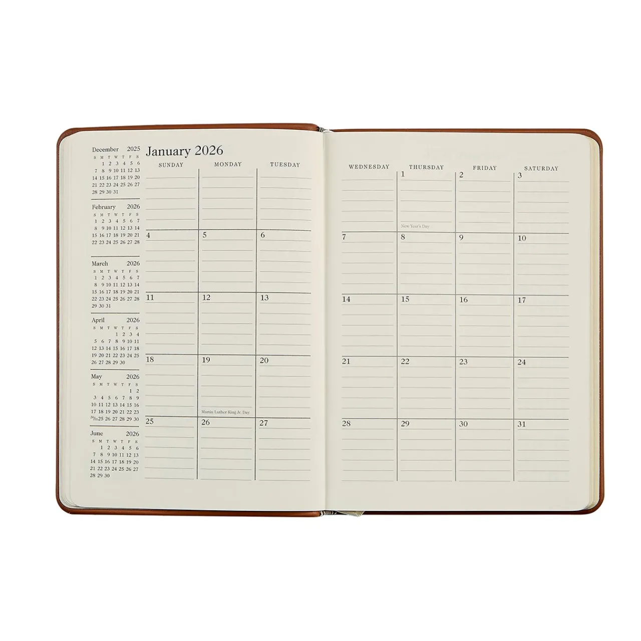 This 2026 leather agenda and appointment book makes the perfect accessory for home or office. This versatile leather notebook planner features month- and week-at-a-view appointment pages plus pages for keeping notes on your daily activities. It also includes recreational travel information and U.S. and international holidays. Handmade in the USA.