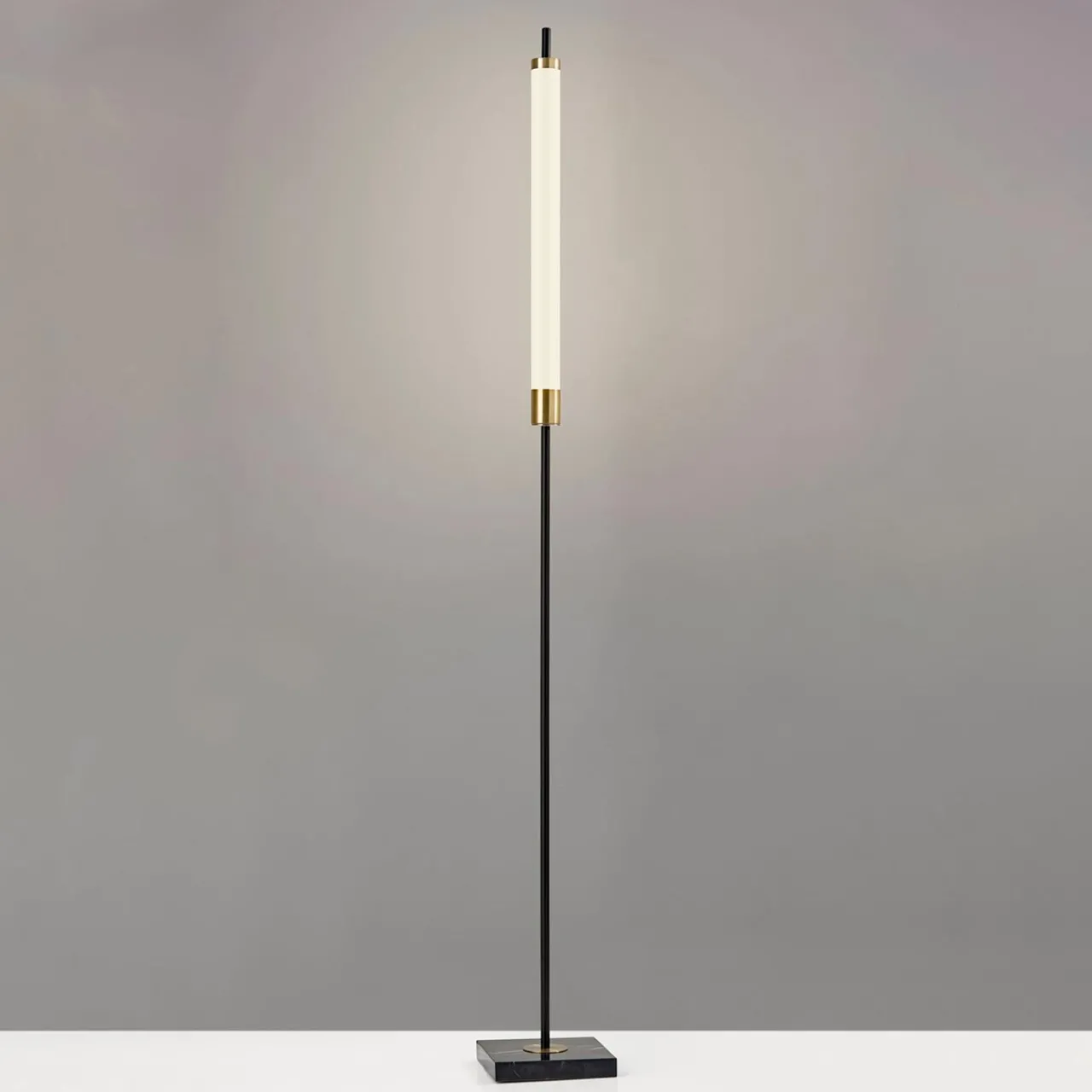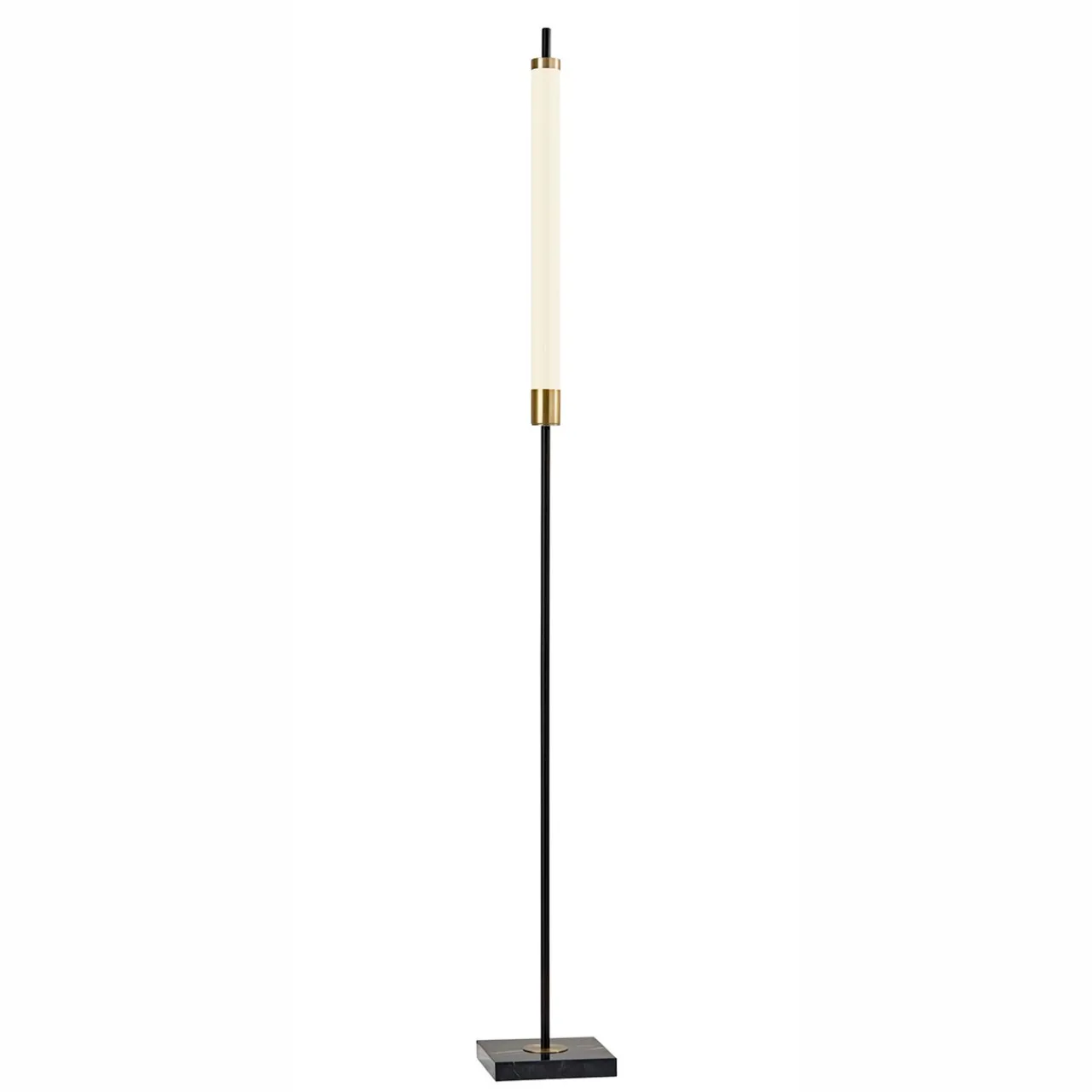 Slim and striking, the Candle Stick LED Floor Lamp brings a hint of drama and elegance to any room. Inspired by mid-century modern design, this sleek silhouette features a matte black finish with antique brass accents and a black marble base. The frosted LED cylinder casts a warm, ambient glow—perfect for illuminating dark corners or adding depth and dimension to your décor. A 4-way touch switch offers a range of brightness settings, from soft mood lighting to focused illumination. With its compact footprint and energy-efficient design, this distinctive floor lamp delivers pleasing light and lasting style—in a shape as graceful as its name.