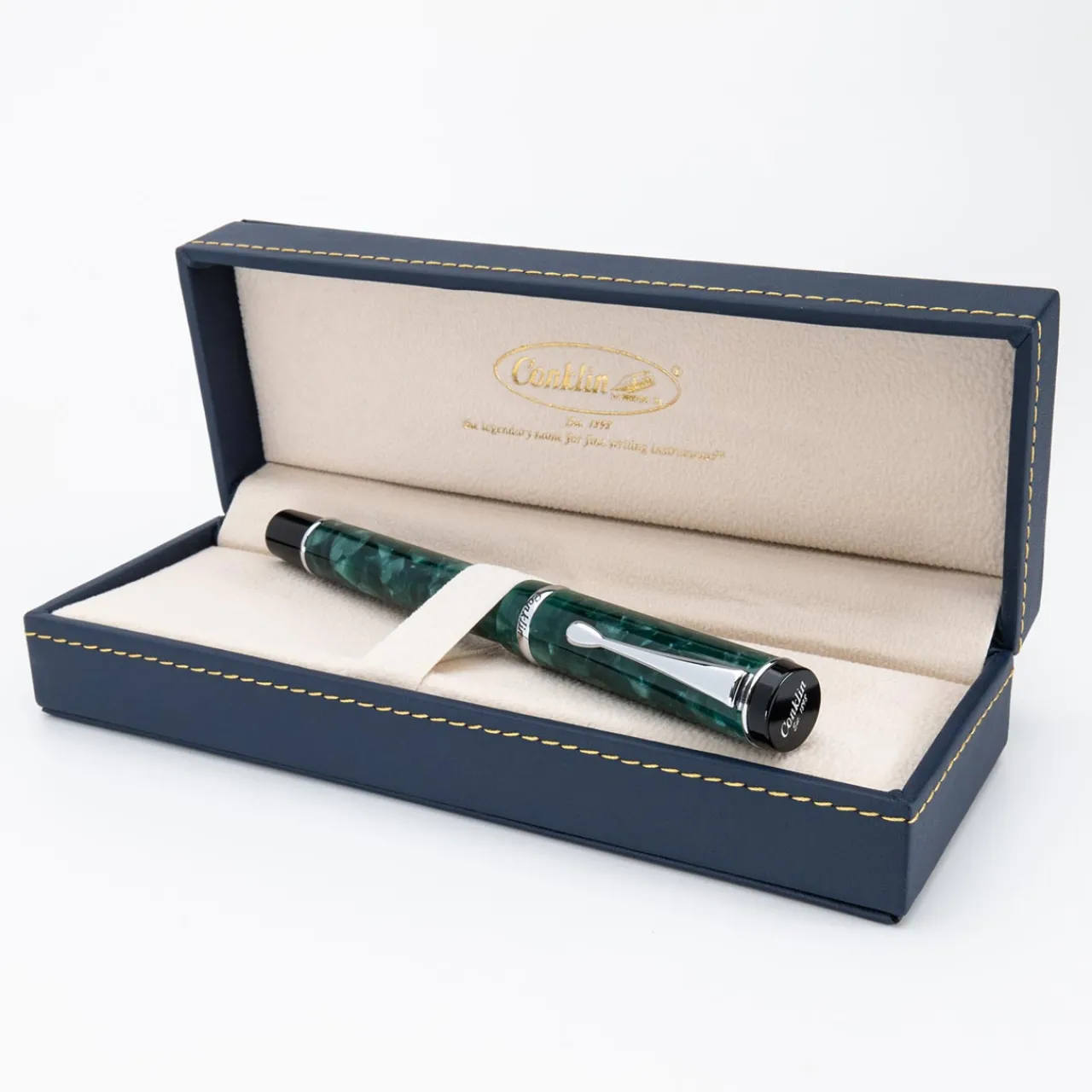 A modern take on a timeless classic, the Conklin Duragraph Forest Green Fountain Pen embodies elegance and practicality in one refined writing instrument. Handcrafted from premium European-grade acrylic resins, its deep forest green body shimmers with natural depth and dimension. The cap is adorned with the Conklin® Est. 1898 logo and features a cap band engraved with the iconic Duragraph™ script flanked by three Conklin® crescent logos, honoring over a century of fine writing tradition. A top-mounted clip ensures the pen sits low in the pocket, combining vintage-inspired charm with everyday practicality. Fine or Medium.