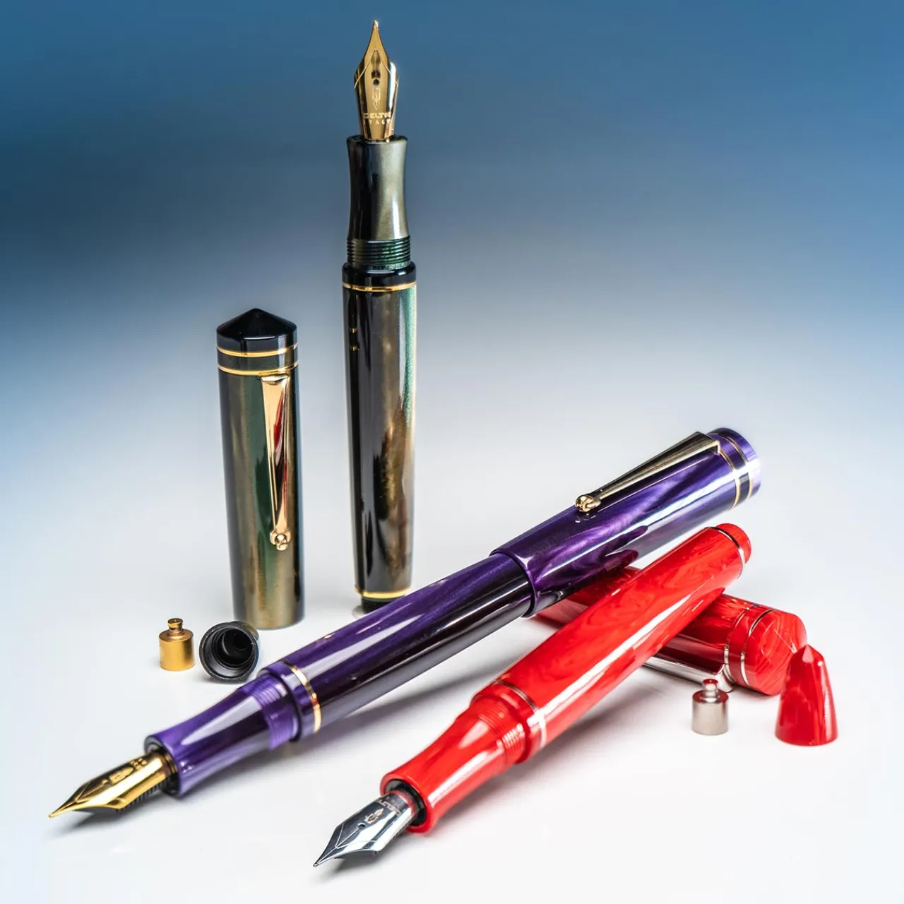 Handcrafted in Italy, the Delta Write Balance Fountain Pen is specially designed to offer optimal balance for the user to reduce fatigue and provide a more comfortable writing experience. The Write Balance pen features a removable two-gram weight, which can be added or removed depending on personal preference. With the weight inserted into the cone, the fountain pen’s balance is shifted toward the back end, meaning that the user’s hand is more involved in the writing. (This top-weighted center of gravity is often preferred by calligraphers.) With the weight removed from the pen, the balance is weighted toward the nib. (This is typically the most comfortable balance for everyday use.) The Delta Write Balance features a beautifully tapered cap and barrel turned from rich Italian resins. Each pen is handsomely adorned with four accent rings and Delta’s signature roller clip. Fine or Medium.