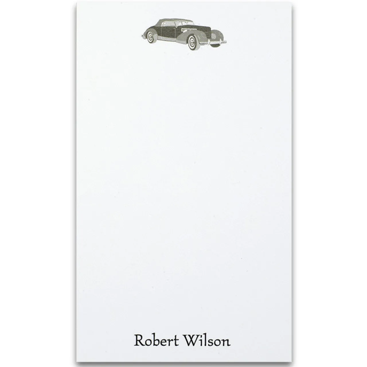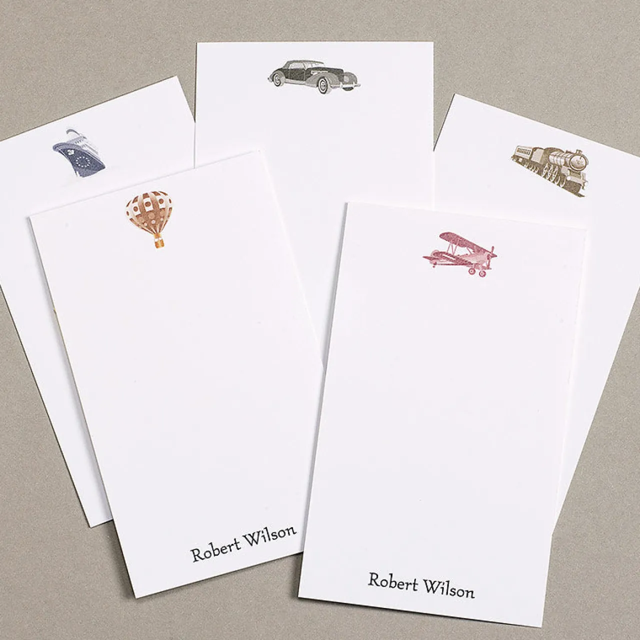 Personalized note cards with retro artwork. Spice up your 3 x 5 note-taking with a dash of pizzazz: Start jotting on these note cards featuring a colorful array of top-centered line drawings depicting retro-style vehicles.