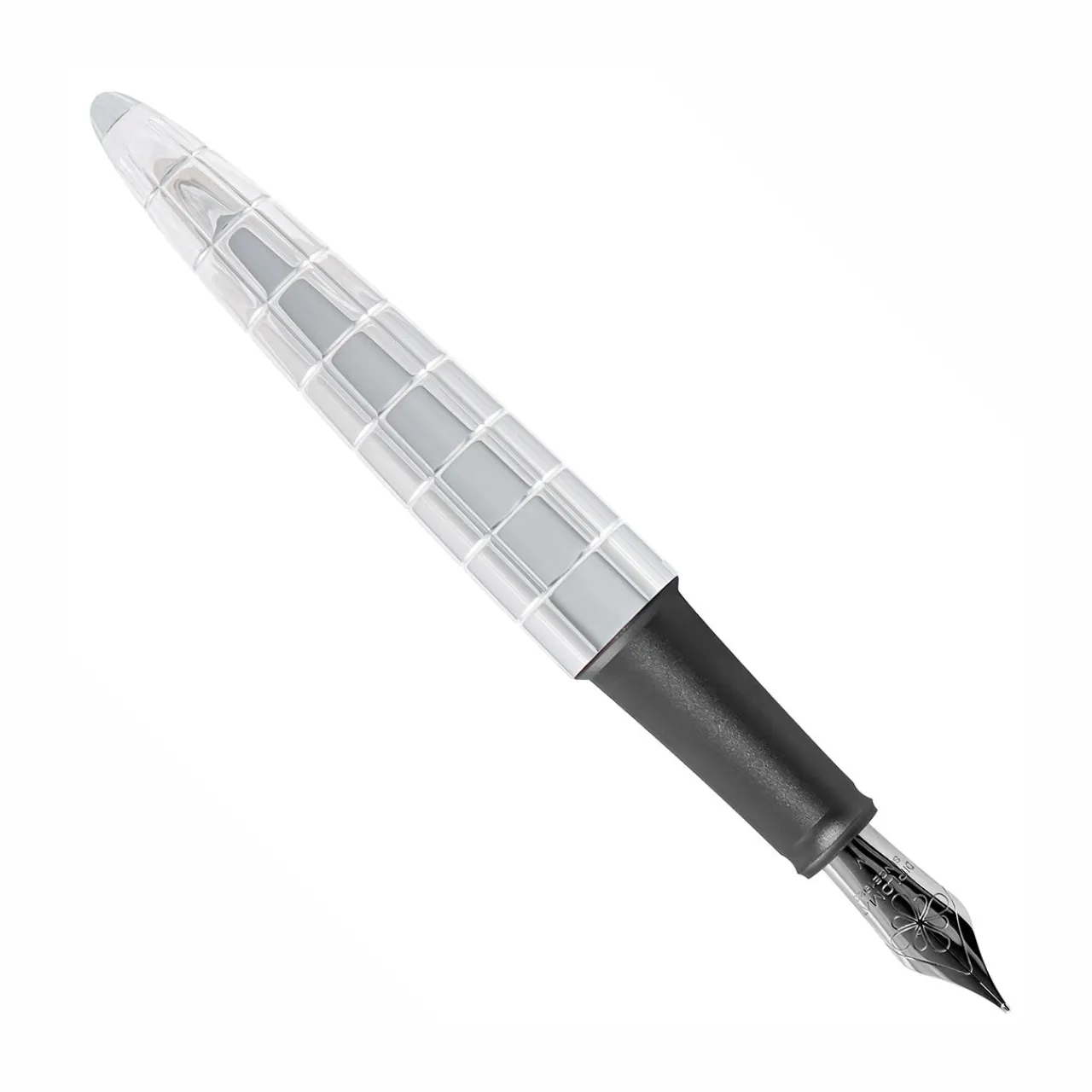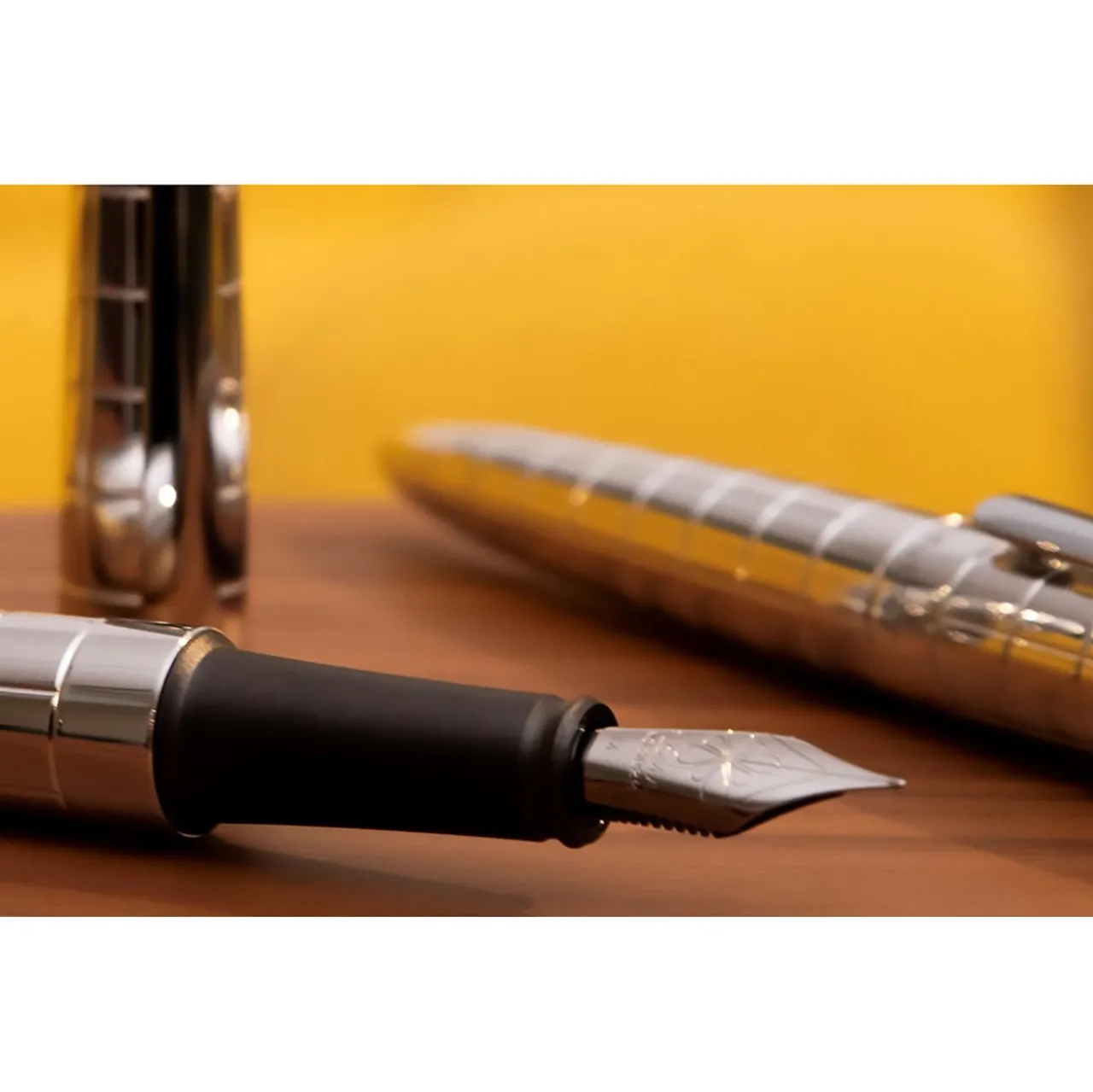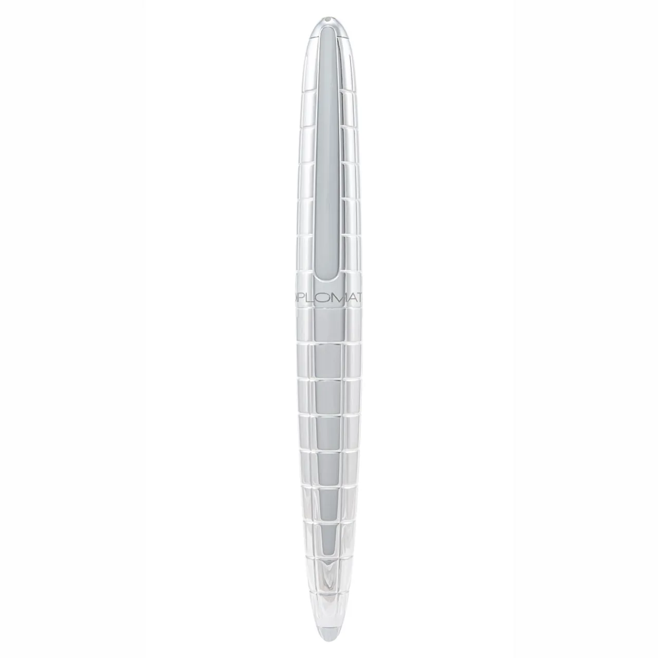 A refined twist on a signature design, the Diplomat Aero Rhomb stands apart with a smooth, streamlined surface in place of the Aero’s traditional grooves. Guilloche engraving adds subtle, concentric rings to the polished aluminum barrel and cap, creating a tactile elegance you can both see and feel. The soft-sliding-click cap posts securely for a comfortable writing experience, while chrome trim and a matte black grip complete the modern silhouette. Sleek, sculptural, and quietly bold—this Diplomat Aero brings understated sophistication to every word. Fine or Medium.
