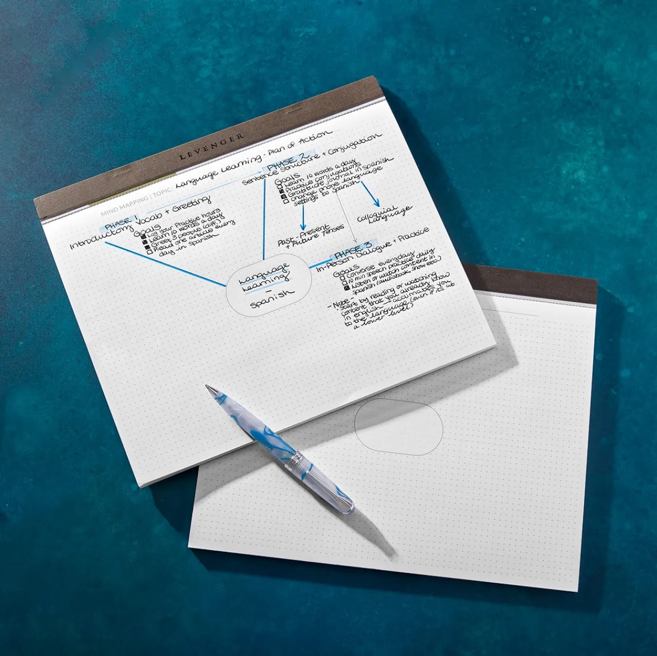 – ‘Mind-map’ format on front, with dot grid pattern and ellipsis in the center for your goal or main idea