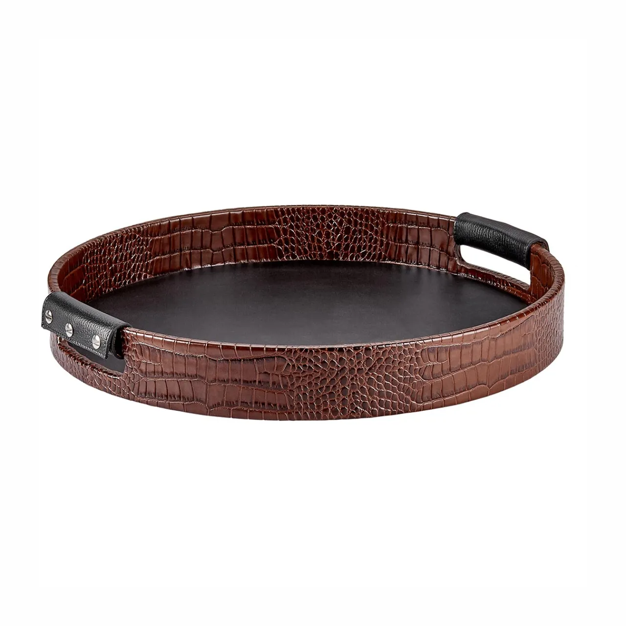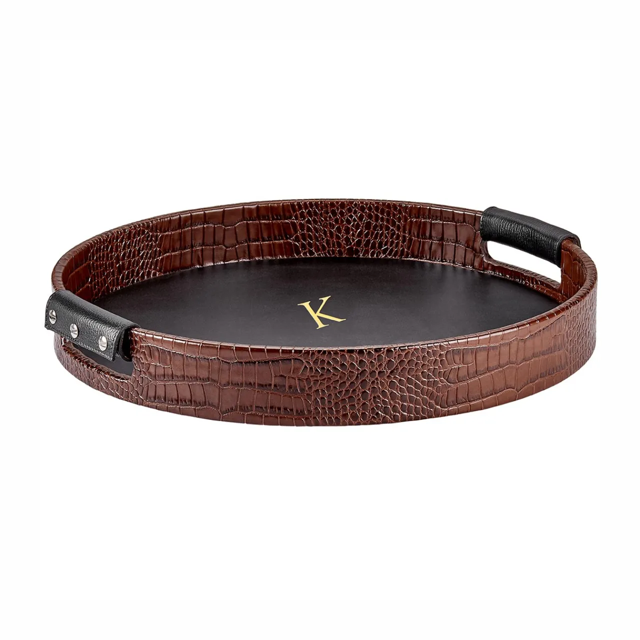 Tray chic! Finished in Italian embossed leather, with complementary interior leather bottom and leather handles, this 15″ round tray serves up drinks or hors d’oeuvres in sleek, stylish fashion. Up to 3 initials of personalization in gold foil available. Handcrafted in the USA.