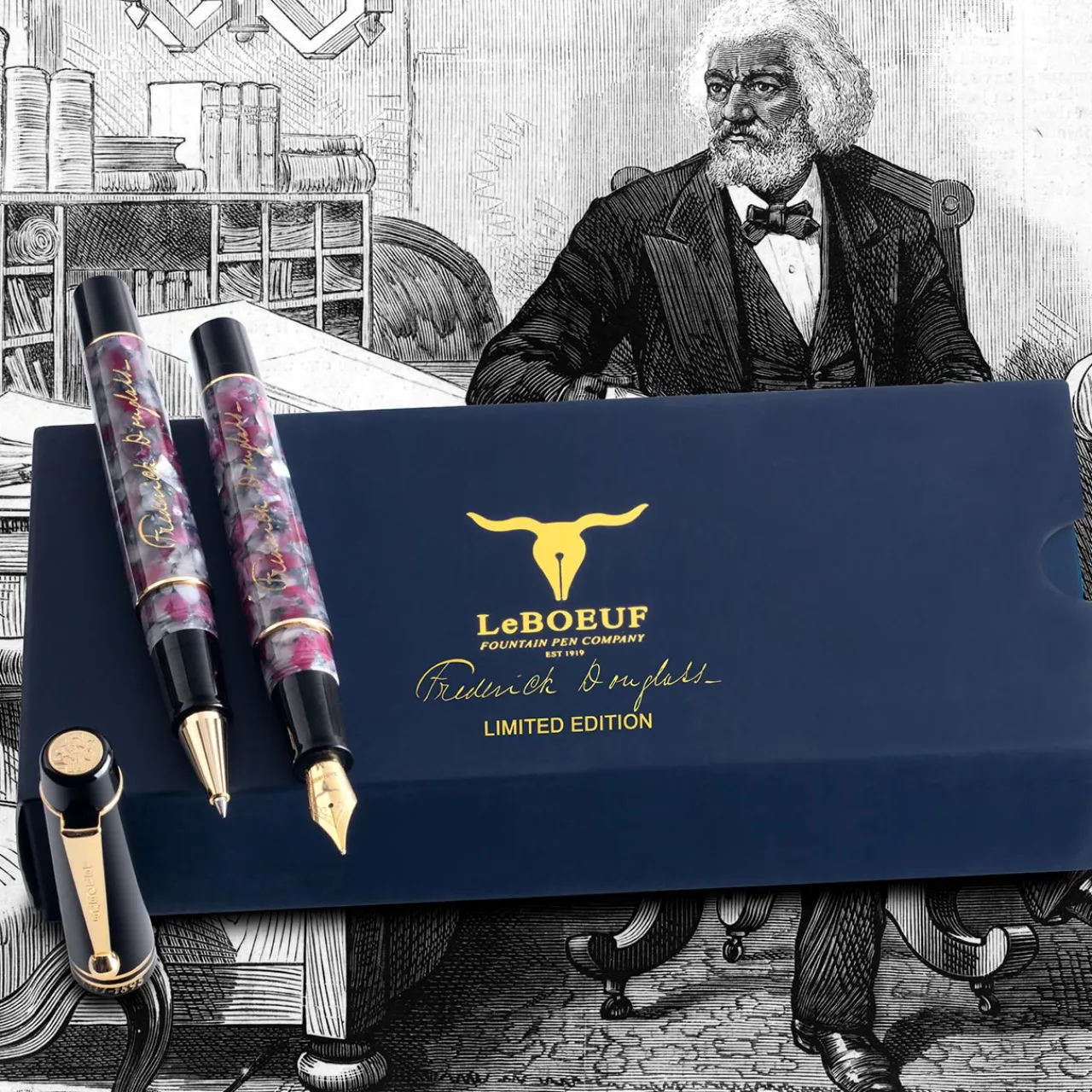 Celebrate the legacy of the Father of the Civil Rights Movement with the LeBoeuf Limited Edition fountain pen that bears his name. Born into slavery, Frederick Douglass (1818–1895) escaped to freedom and became a renowned abolitionist, orator and advocate for equality. His fearless activism and powerful writings reshaped the fight for civil rights and women’s suffrage. Crafted from stunning Smoke Gray and Lilac marble acrylic—honoring Rochester, New York, where Douglass spent his later years—this pen features his engraved signature and a commemorative gold coin on the cap. A true tribute to an American hero whose fight for equality and freedom still inspires. Fine or Medium.