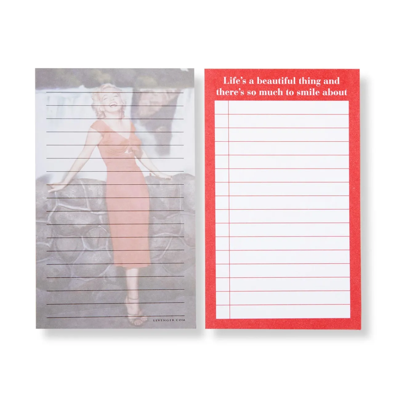 Jot on-the-go notes the 3 x 5 way with Marilyn Monroe™. The ruled front of each limited-edition index card features a color photo fade from the hit 1952 film Niagara, which put her on the map as Hollywood’s newest superstar. On the back is one of Marilyn’s quotes, “Life’s a beautiful thing and there’s so much to smile about” and a ruled checklist format for lists. Set of 25.