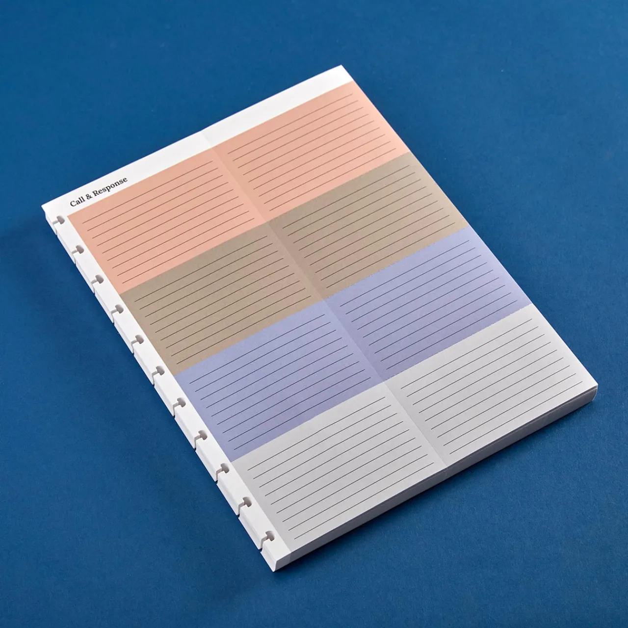 – Circa Call and Response Discbound Refill, 100 Circa-punched and perforated sheets of 120-gsm paper, each yielding 8 cards per sheet in 4 colorways, for flash card learning, in letter size, 8 1/2W x 11H