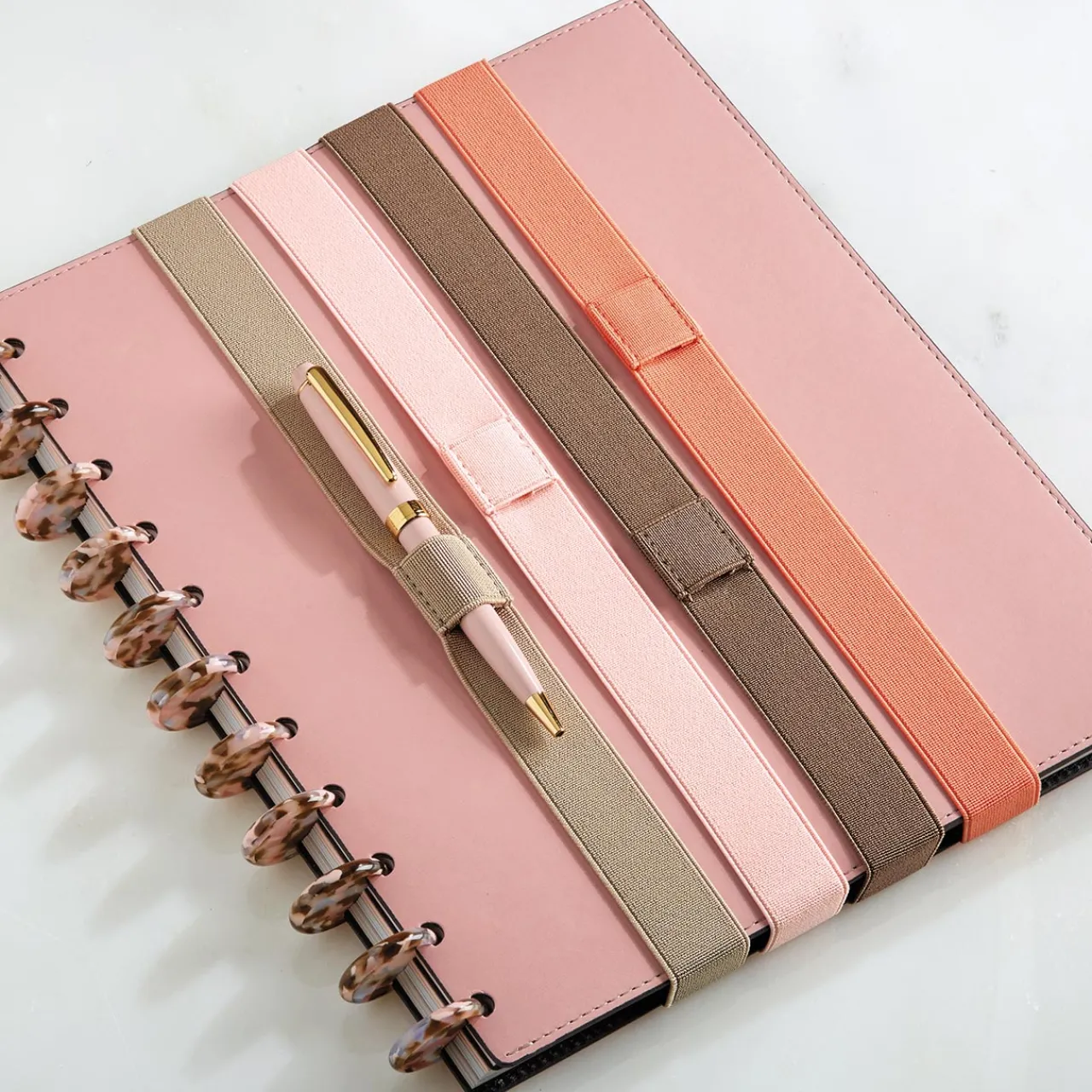 Softly colorful elastic bookmarks for book or binder. Protect your precious texts with our Modern Notebook Belts. These durable elastic straps keep your book, journal, agenda or binder securely shut. Always keep your pen nearby—Notebook Belts are equipped with an elastic pen loop that can fit any writing utensil up to 1/2″ in diameter. Set of 4, one each in Soft Coral, Taupe, Pale Pink and Shadow.