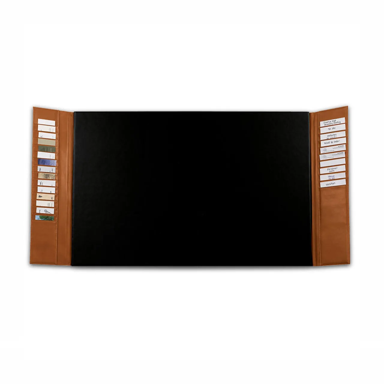 Create a great deskscape, starting with this full-grain leather desk mat. The Morgan leather desk blotter helps keep your workspace beautifully organized. The fold-up wings on either side offer card storage underneath: the left side can hold 15 business cards, and the right side 10 3 x 5 index cards. The smooth writing surface can be used with or without a desk pad or blotter, and the felt bottom protects your desk.