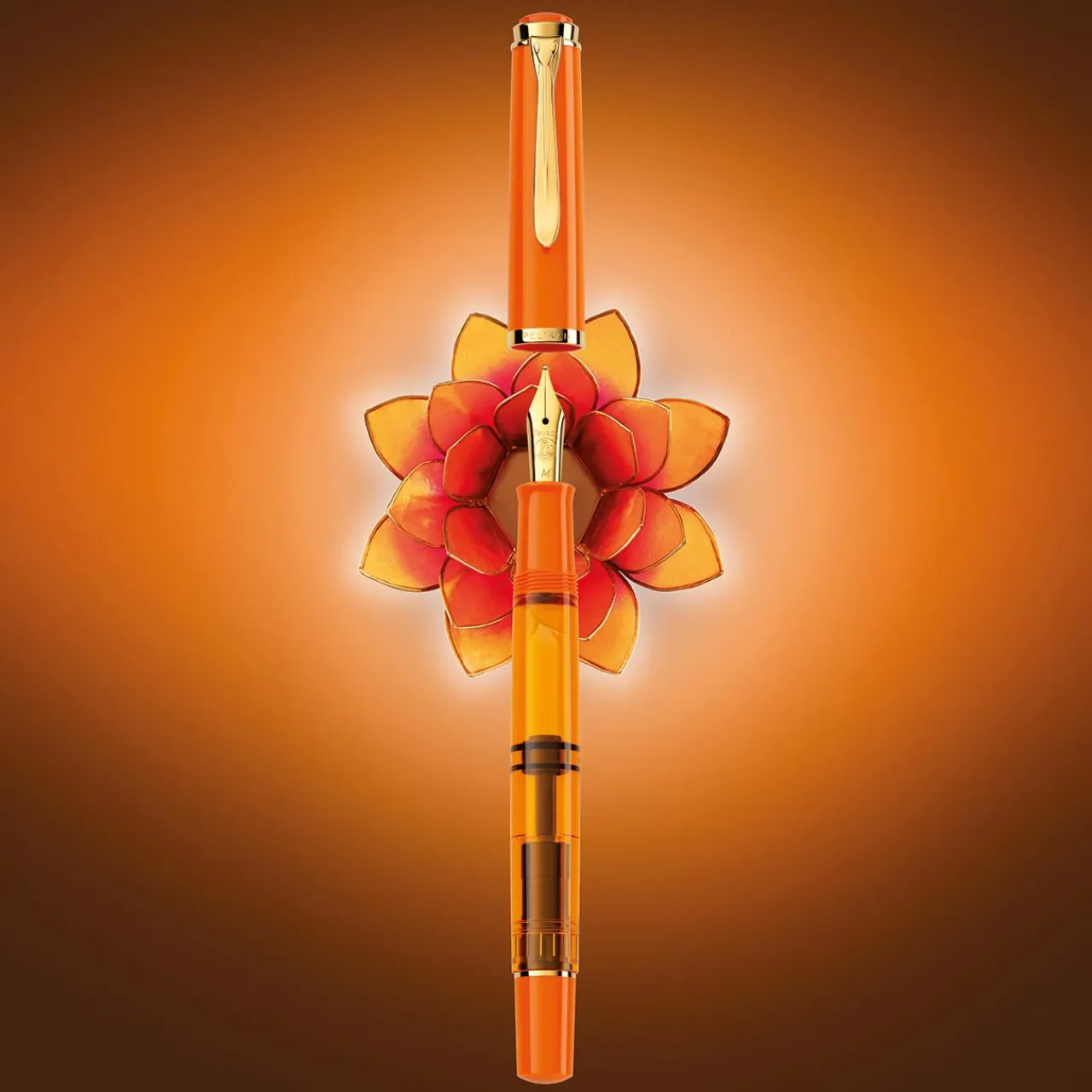 With its highly polished precious resin barrel in a cozy and inviting shade of orange, this limited edition Pelikan M200 fountain pen promises pure writing delight. The gleaming gold-plated rings and trademark beak-shaped clip underline the showy appeal of this brilliantly colorful fountain pen design. The translucent demonstrator-type center allows you to see the pen’s inner workings, and the piston fill system is designed for bottled inks only. Made in Germany.