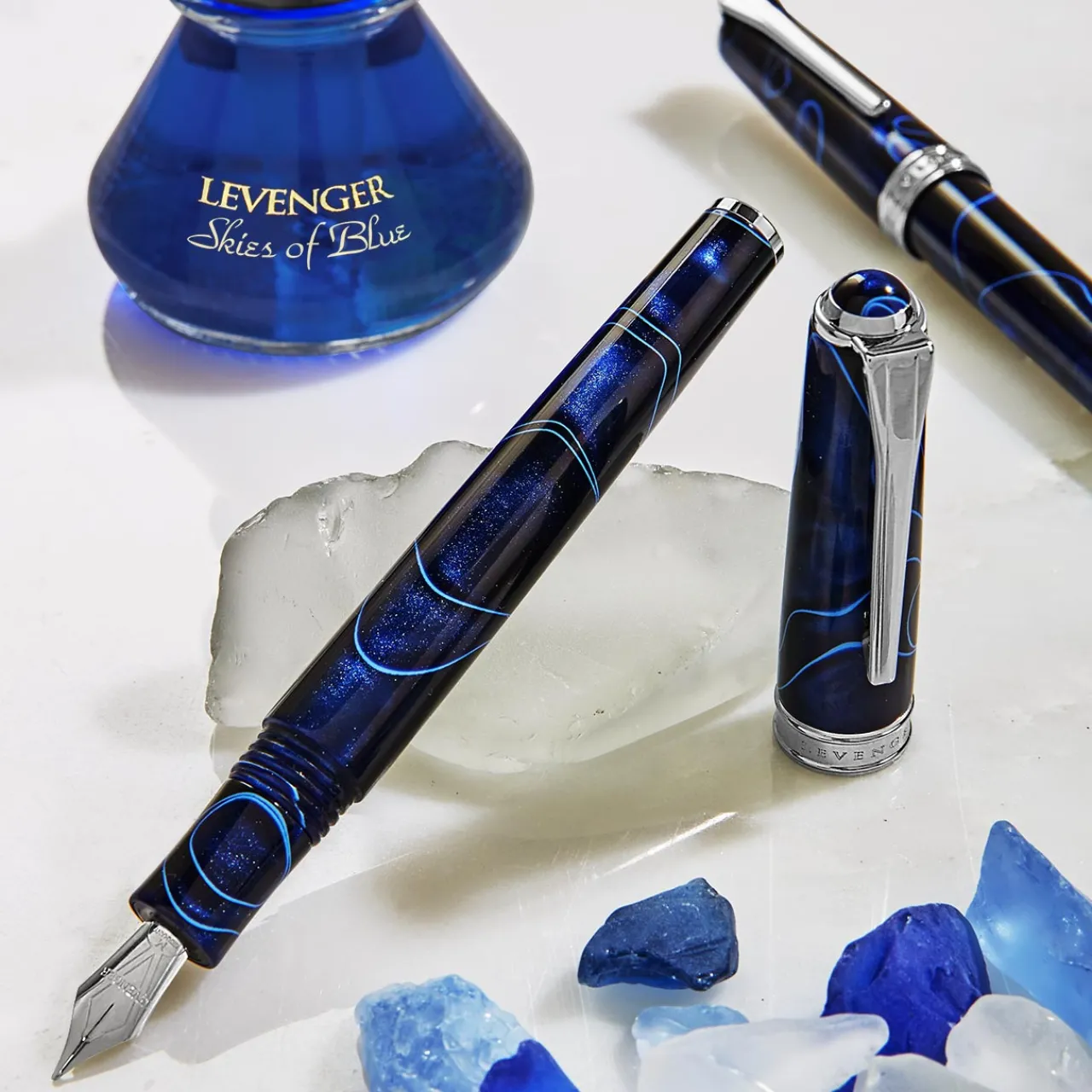 – Hand-turned blue resin barrel with electric blue flares