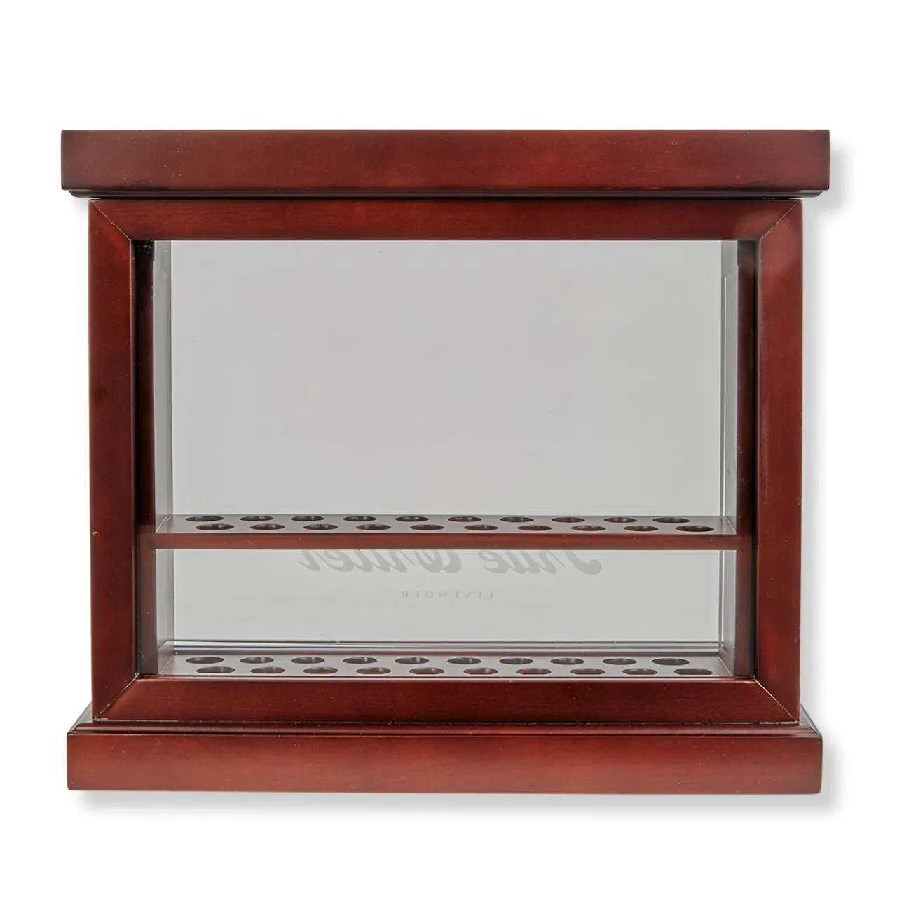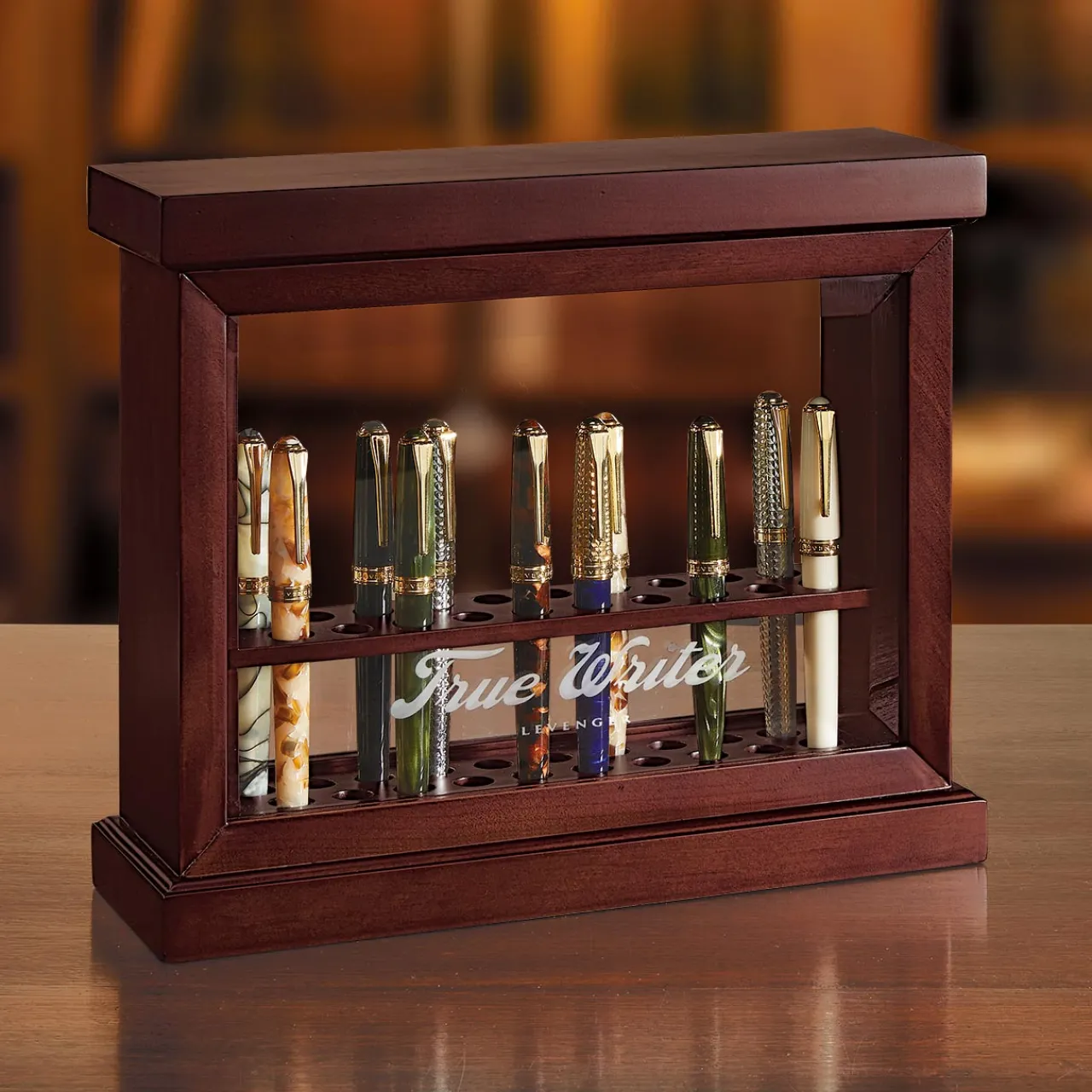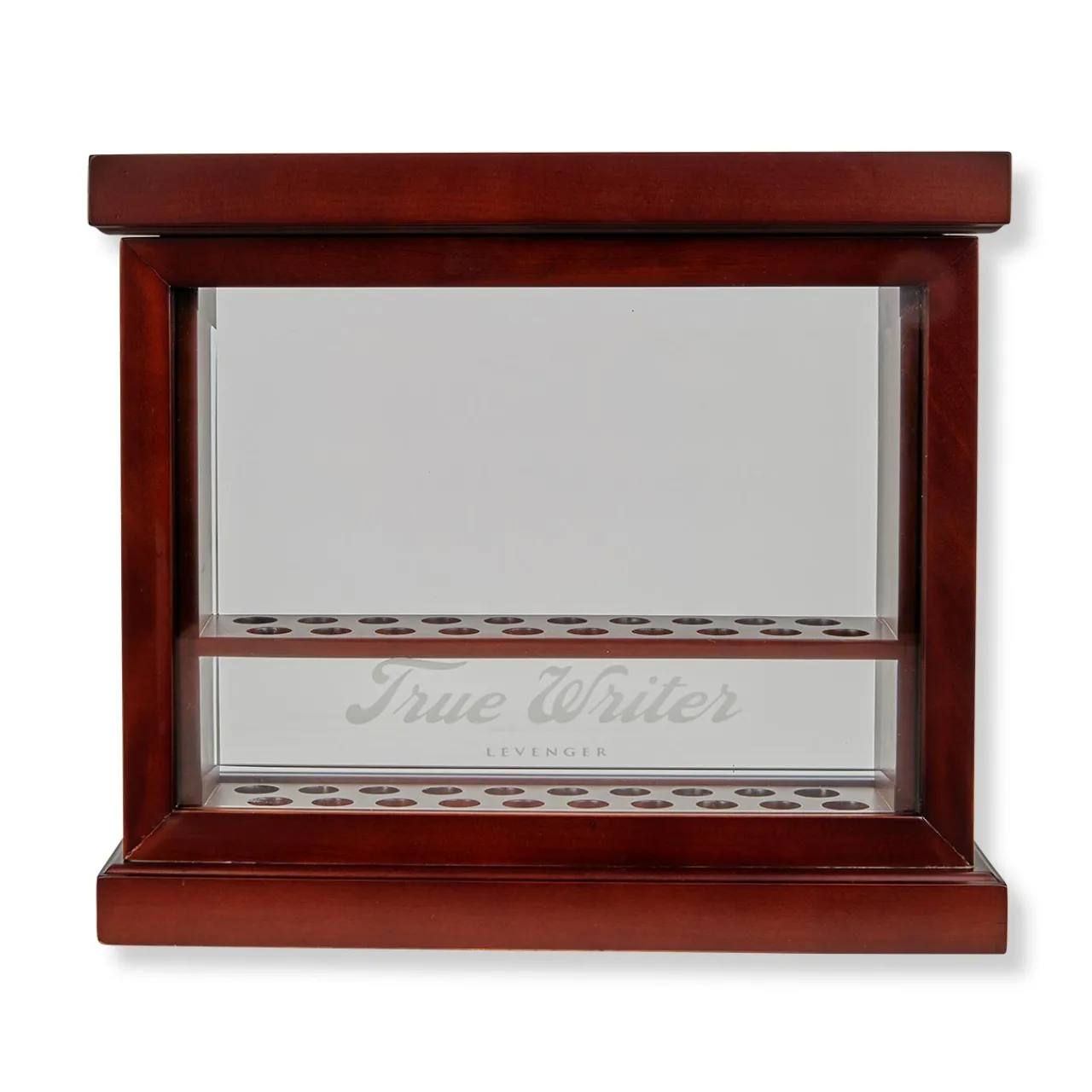 A Levenger classic for pen lovers returns, requested by customers like you. Try viewing your pen collection in an artful way. Display prized pens to their best advantage in the True Writer Museum Pen Case. This wood and beveled glass pen case stands upright, rendering a compact footprint so it will fit where horizontal cases can’t. The case can hold up to 20 pens, including larger and taller pen designs. Just lift the top to add or remove pens. You can also pull the wood insert all the way out for closer examination of your collection. The original 1999 logo is etched onto the glass, commemorating the birth of ‘the extraordinary everyday pen.’