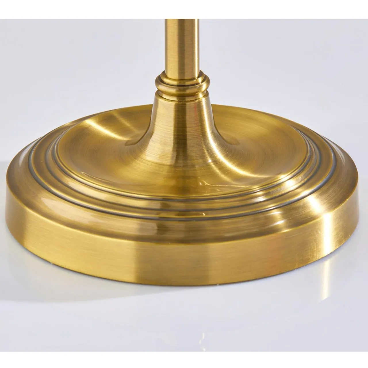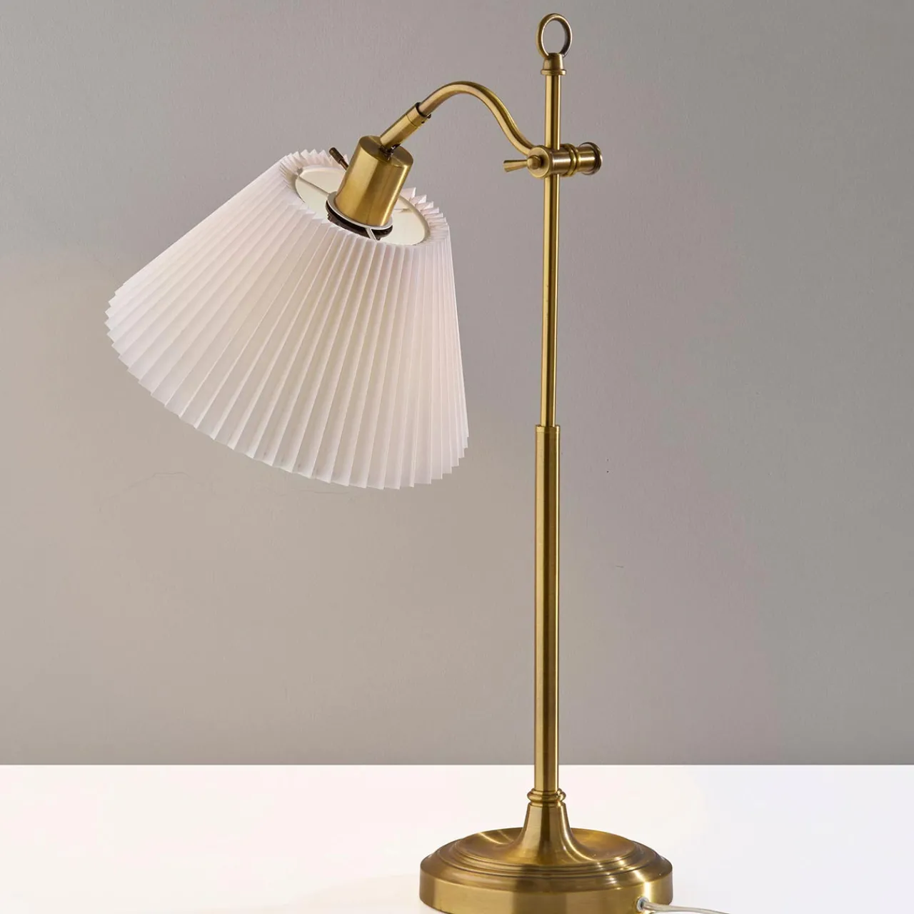 The Amherst Table Lamp brings timeless sophistication and flexible functionality to any room—an elegant companion for quiet moments of contemplation. Finished in warm Antique Brass, it evokes vintage charm, while the adjustable pleated white fabric shade casts a soft, inviting glow. This graceful reading lamp features a 3-way rotary socket with three brightness levels, perfect for reading, writing, or simply reflecting. Named for the poet’s hometown, the Amherst is a tribute to Emily Dickinson’s world of quiet brilliance—a lamp that lights the way for thinkers, dreamers and lovers of words.