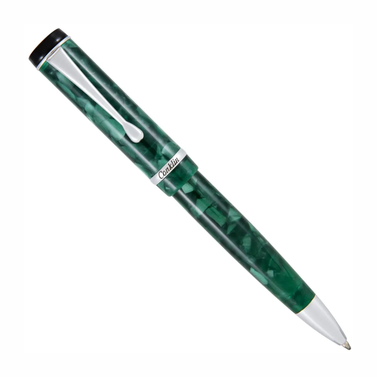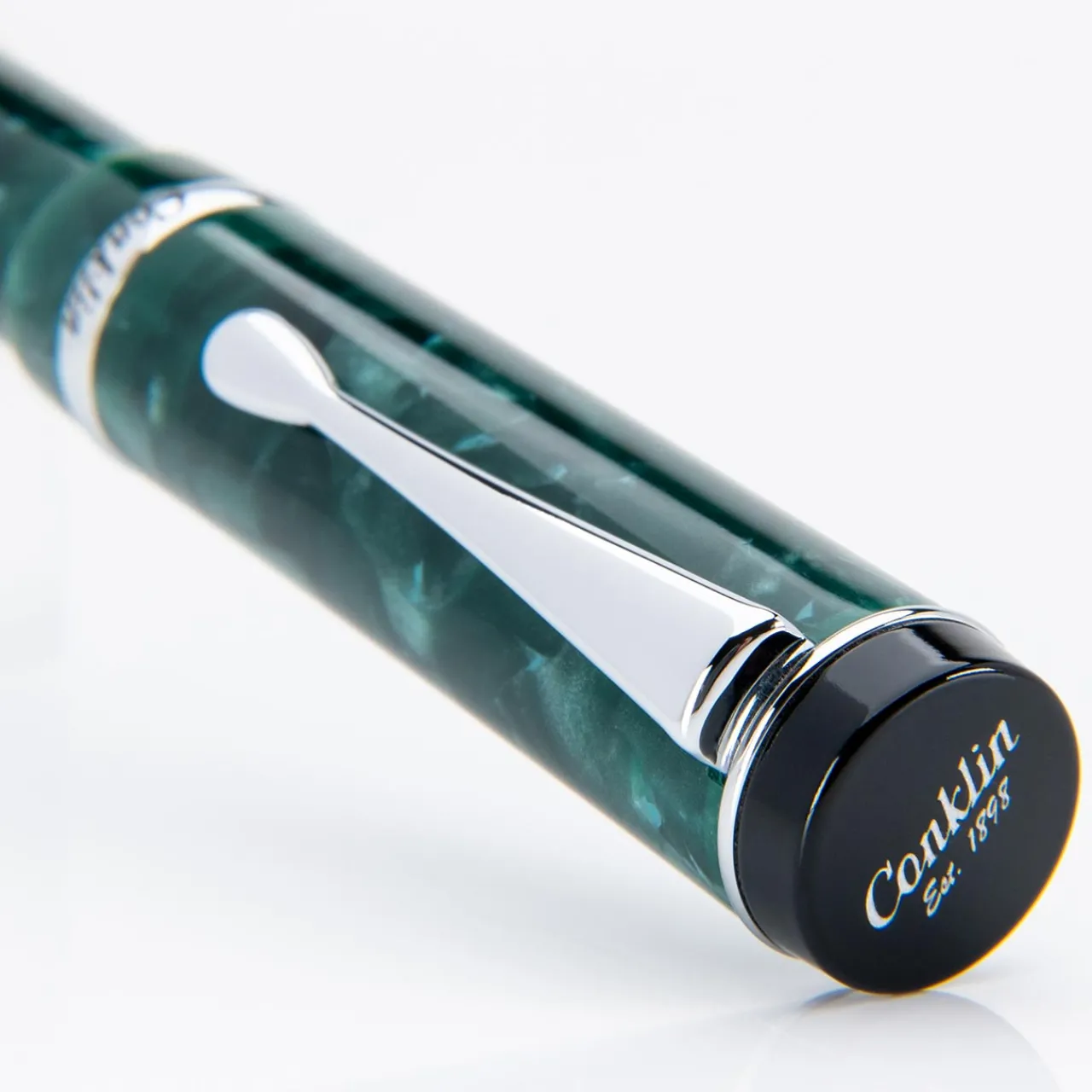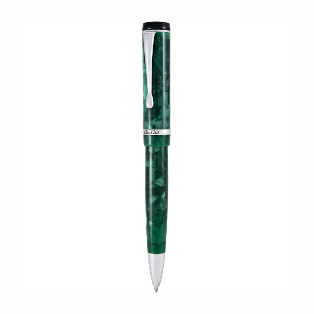 A modern take on a timeless classic, the Conklin Duragraph Forest Green Ballpoint Pen embodies elegance and practicality in one refined writing instrument. Handcrafted from premium European-grade acrylic resins, its deep forest green body shimmers with natural depth and dimension. The cap is adorned with the Conklin® Est. 1898 logo and features a cap band engraved with the iconic Duragraph™ script flanked by three Conklin® crescent logos, honoring over a century of fine writing tradition. A top-mounted clip ensures the pen sits low in the pocket, combining vintage-inspired charm with everyday practicality.