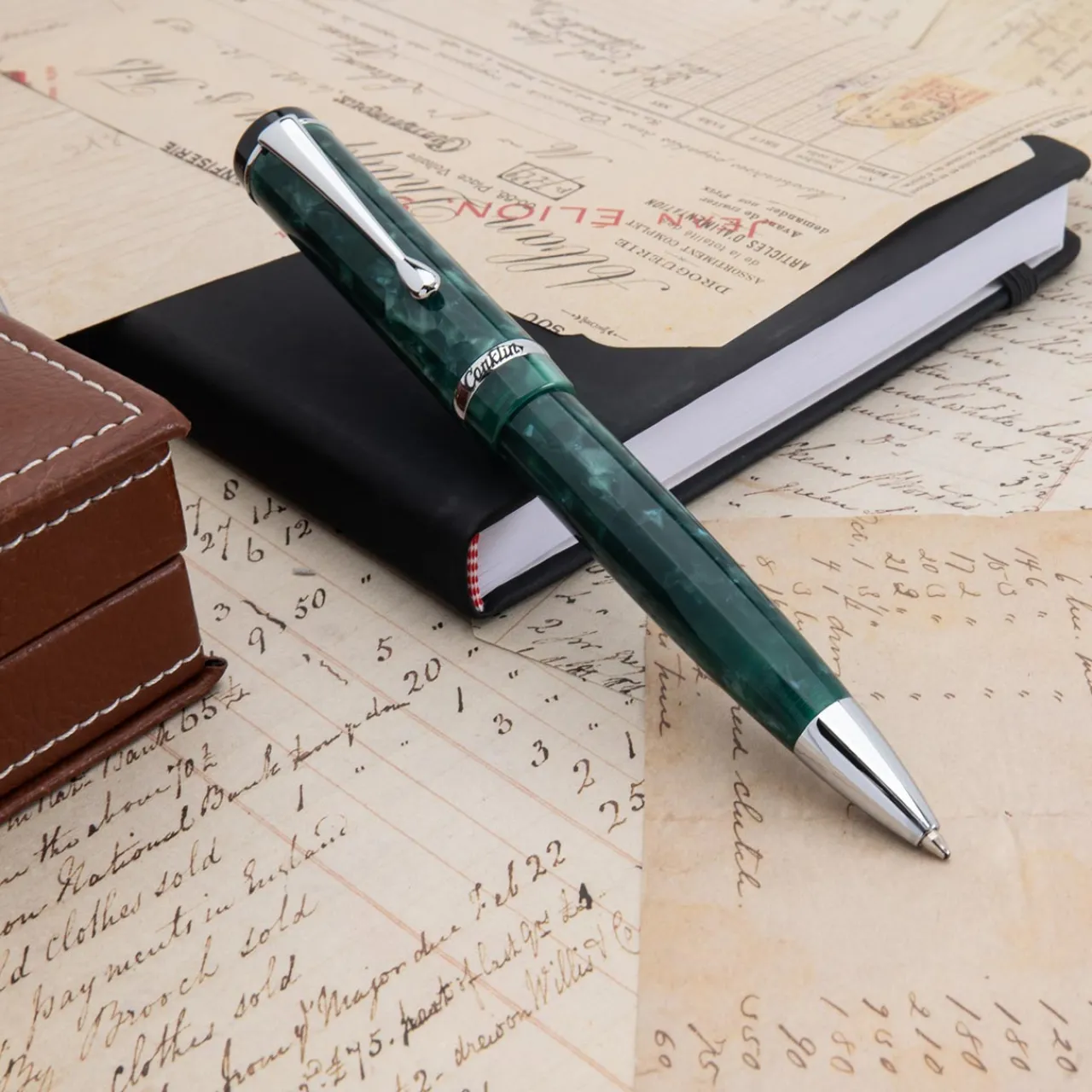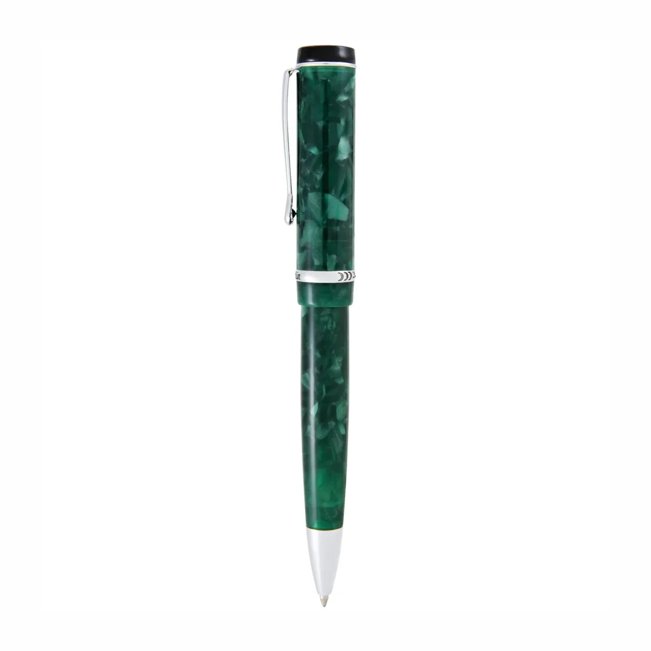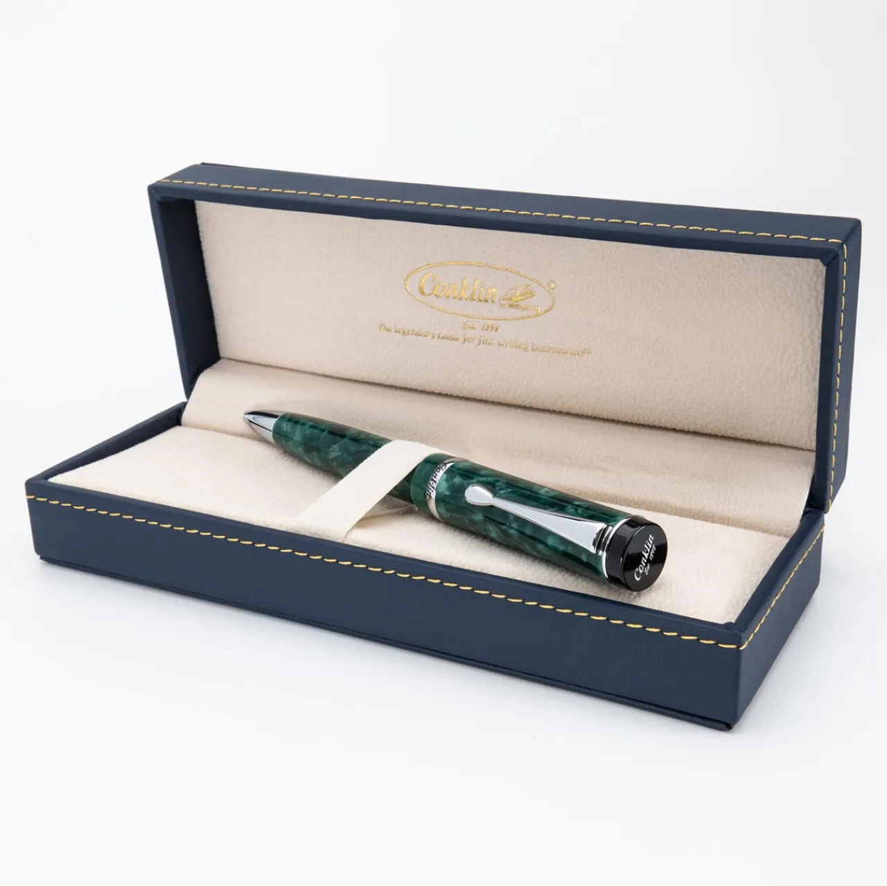 A modern take on a timeless classic, the Conklin Duragraph Forest Green Ballpoint Pen embodies elegance and practicality in one refined writing instrument. Handcrafted from premium European-grade acrylic resins, its deep forest green body shimmers with natural depth and dimension. The cap is adorned with the Conklin® Est. 1898 logo and features a cap band engraved with the iconic Duragraph™ script flanked by three Conklin® crescent logos, honoring over a century of fine writing tradition. A top-mounted clip ensures the pen sits low in the pocket, combining vintage-inspired charm with everyday practicality.