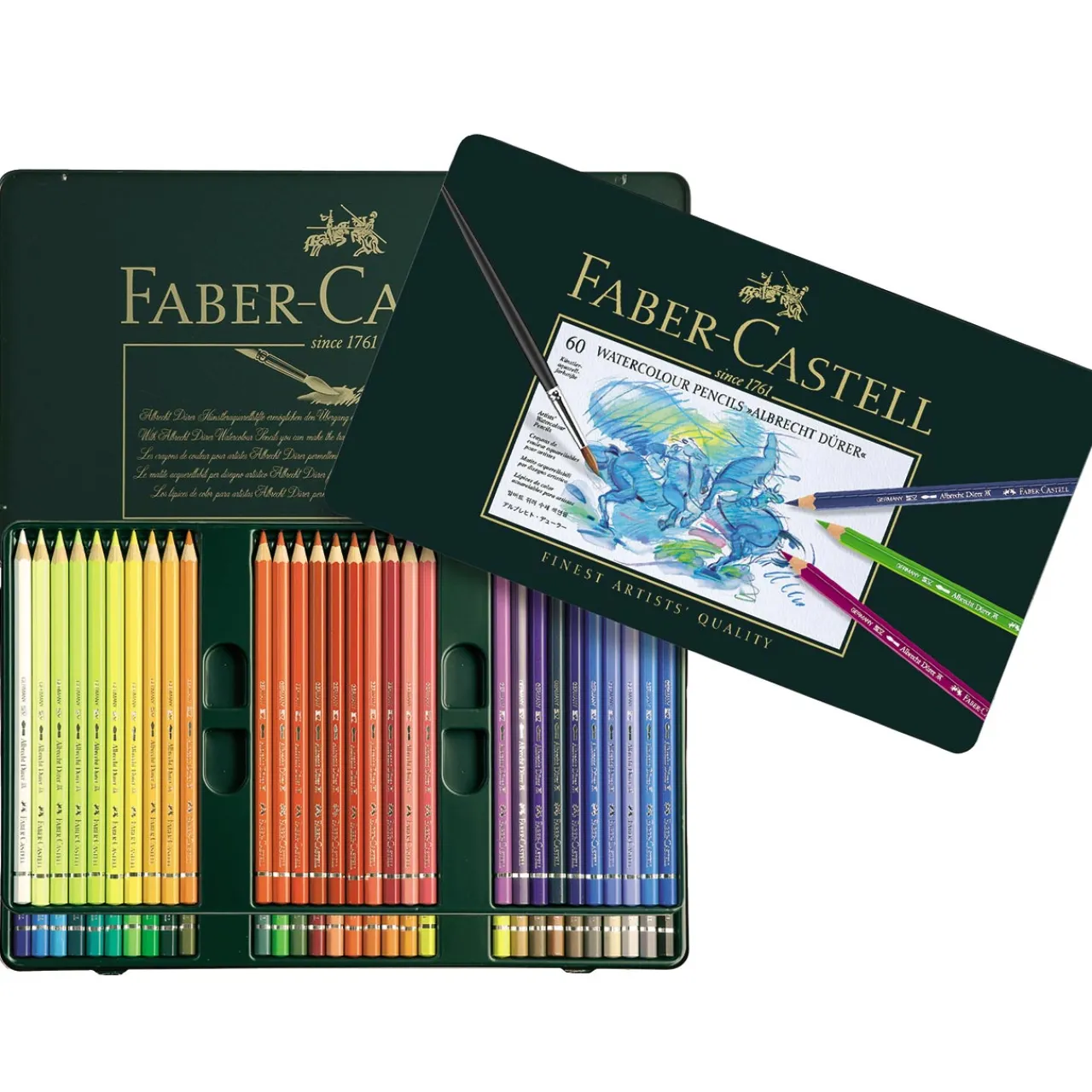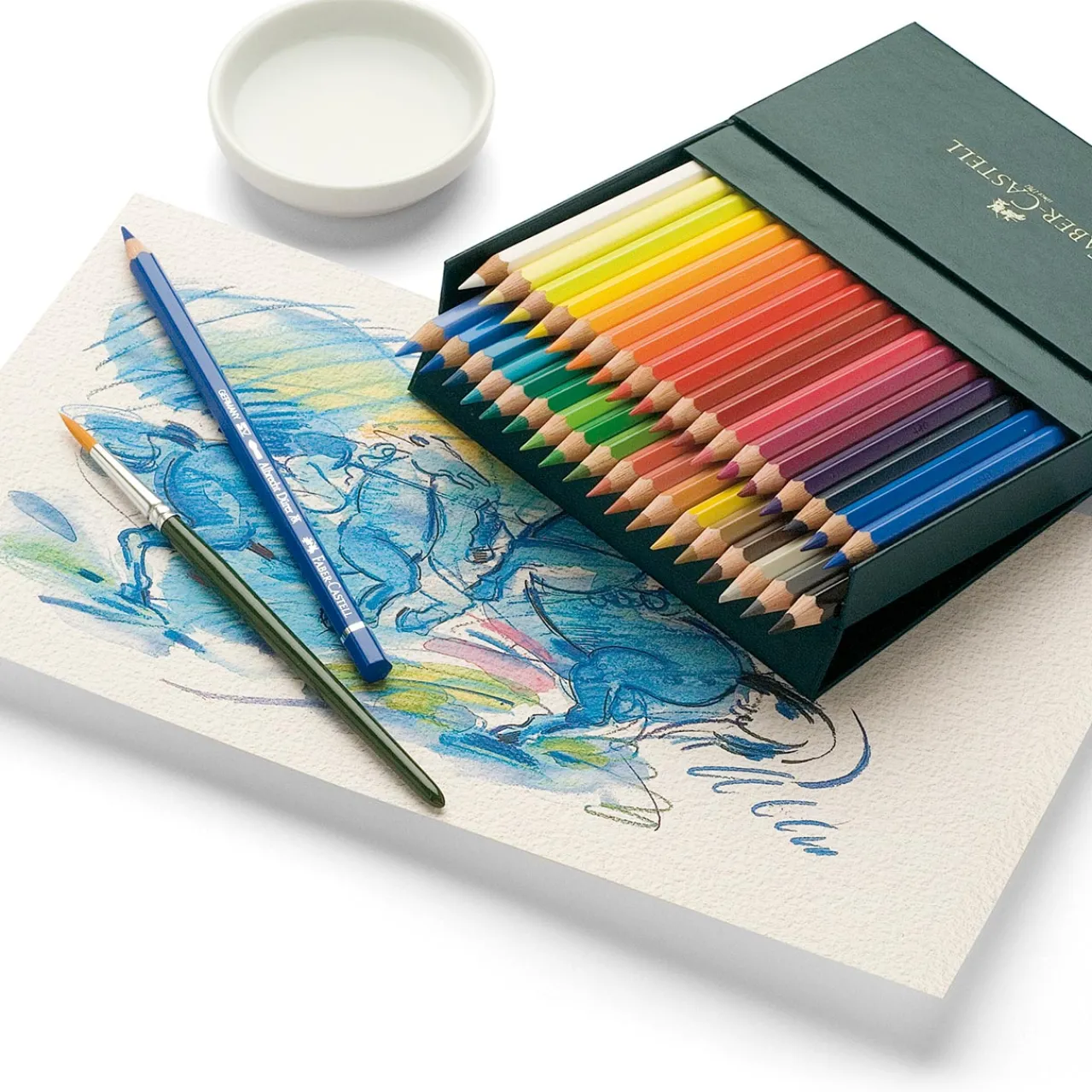 Drawing, sketching, shading, and painting in watercolors becomes effortless and tote-able via this must-gift set. Inspired by the German Renaissance artist Albrecht Durer. Faber-Castell is pleased to offer watercolor pencils of the utmost quality, bearing his name and recognizing his legacy. The finest quality pigments are used to create this versatile watercolor set that can be used wet or dry. Fully water-soluble pigments can be completely dissolved, enabling these watercolor pencils to behave in the same way as classic watercolor paints. They can be easily blended when wet to become permanent once dry. These Durer-inspired eco pencils are made of wood from certified sustainable forestry and are coated with environmentally friendly, water-based varnish. They’ll arrive in a sturdy gift case for your favorite artist. Made in Germany.