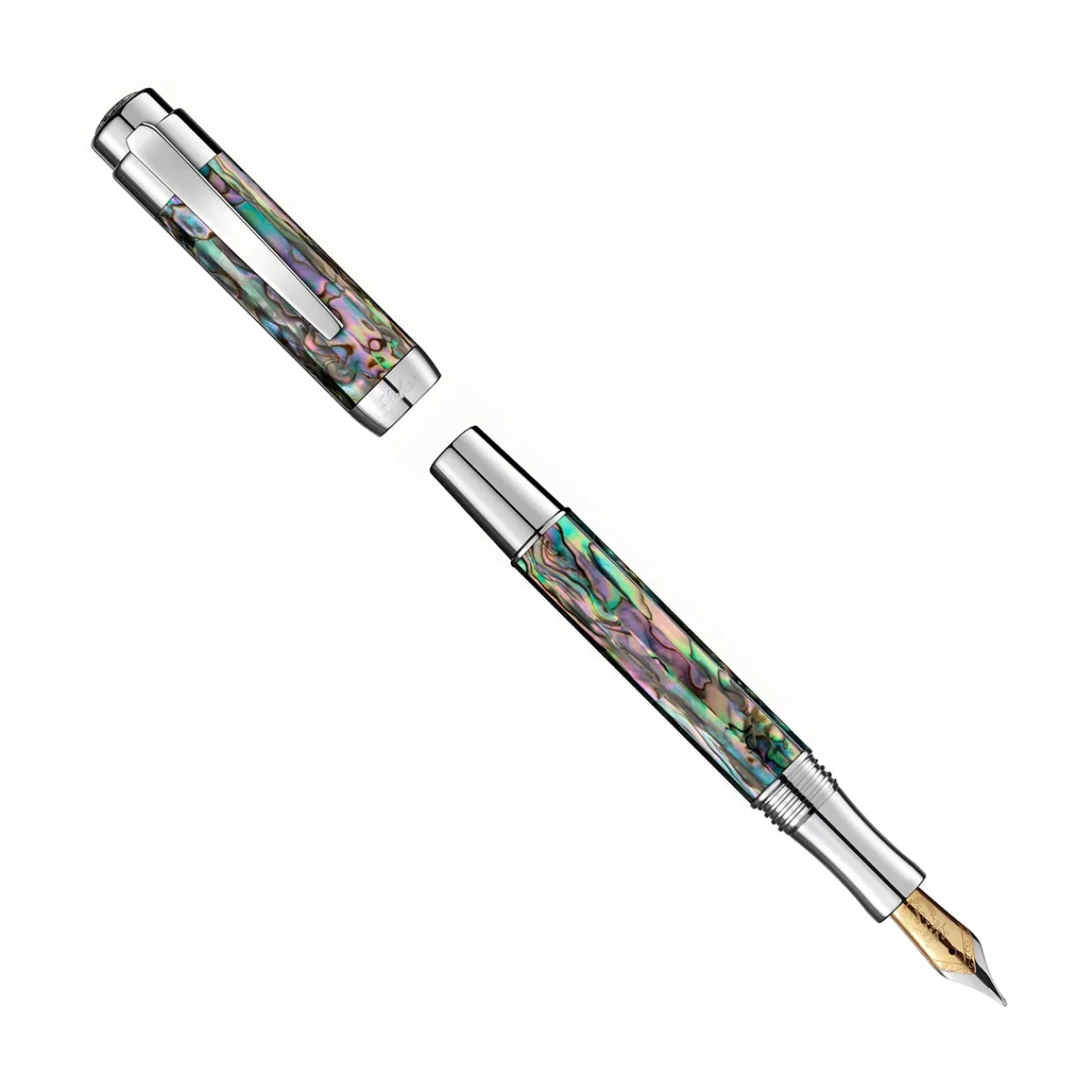 The Laban Abalone Fountain Pen is a luminous tribute to nature’s artistry, adorned with genuine abalone shell sourced from New Zealand. Hand-inlaid in fine sheets, the iridescent barrel shimmers with swirling hues of blue, violet, and green—each pen uniquely patterned by the sea itself. Slightly weightier than acrylic, it offers a grounded, contemplative writing experience. Polished chrome accents and silver-plated trim add a touch of modern elegance to the cap and spring-loaded clip. A true treasure in hand, the Abalone is crafted to inspire reflection, presence, and quiet appreciation with every stroke. Fine or Medium.