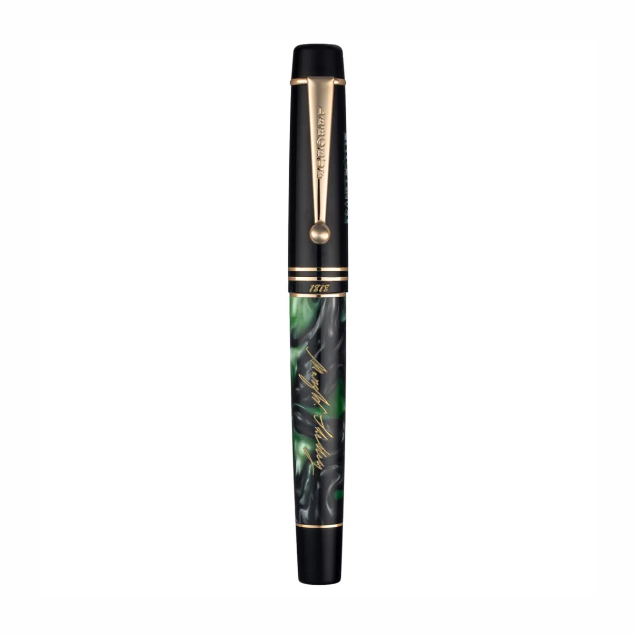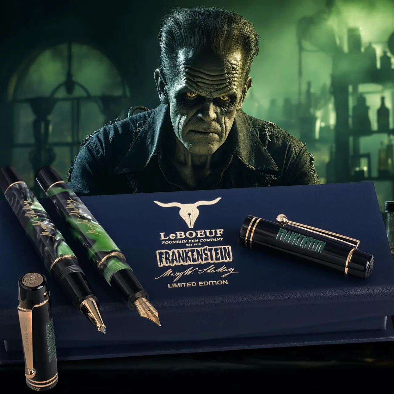 Celebrate literary legend Mary Shelley and her iconic novel Frankenstein with the LeBoeuf Mary Shelley Frankenstein Limited Edition Rollerball Pen. Crafted with a unique monster green swirled acrylic barrel, this pen mirrors the eerie color of Frankenstein’s creature. Shelley’s engraved signature and green lightning bolts on the cap add a striking tribute to her groundbreaking work. A gold-plated embossed coin featuring The Creature’s portrait crowns the cap. Each pen comes in a special commemorative black gift box with Mary Shelley’s signature and the Frankenstein logo.