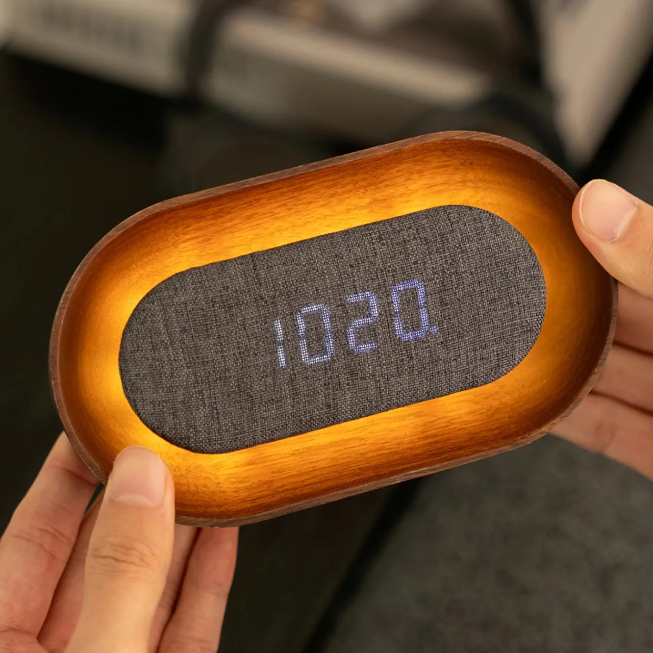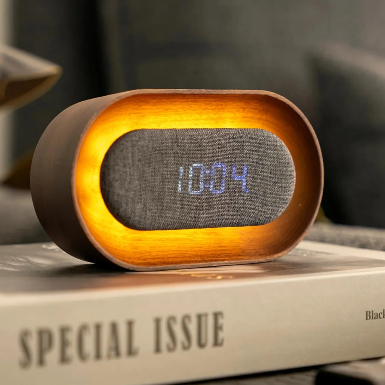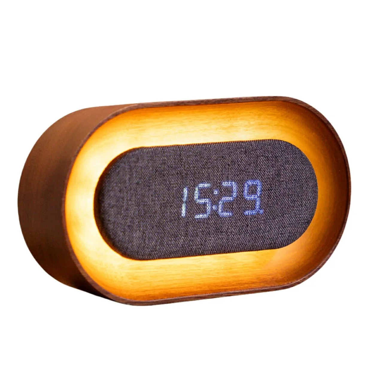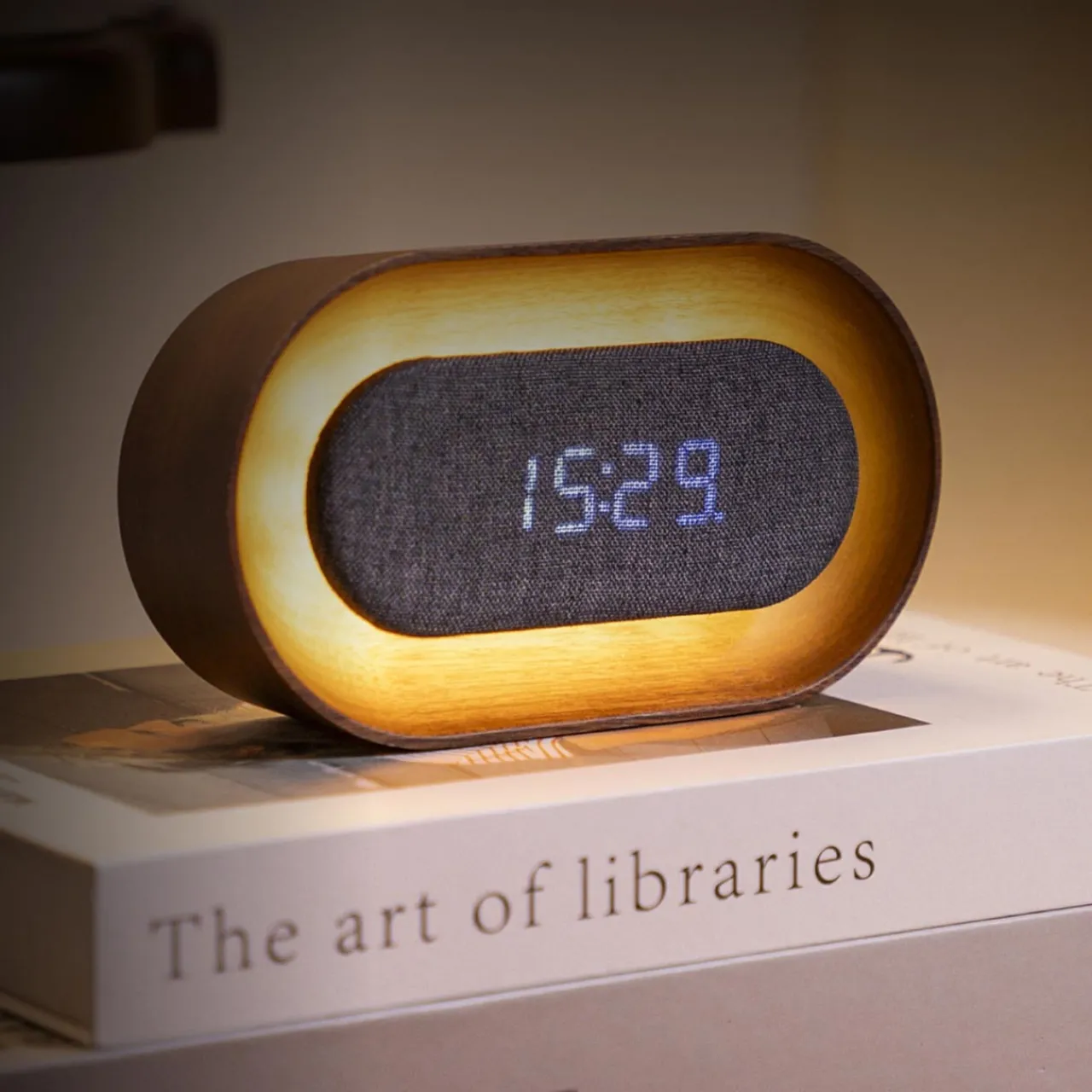 The Lumos Clock is a modern timepiece designed to bring both style and simplicity to your space. Crafted with a sustainably sourced walnut frame, it features a softly glowing night light, intuitive touch controls, and a display that automatically dims in the evening hours. Choose between sound-activated or continuous display modes to suit your routine, all powered by a USB-C rechargeable battery that lasts up to two months on a single charge. Sleek and quietly smart, the Lumos Clock is a refined companion for home, office or bedside.
