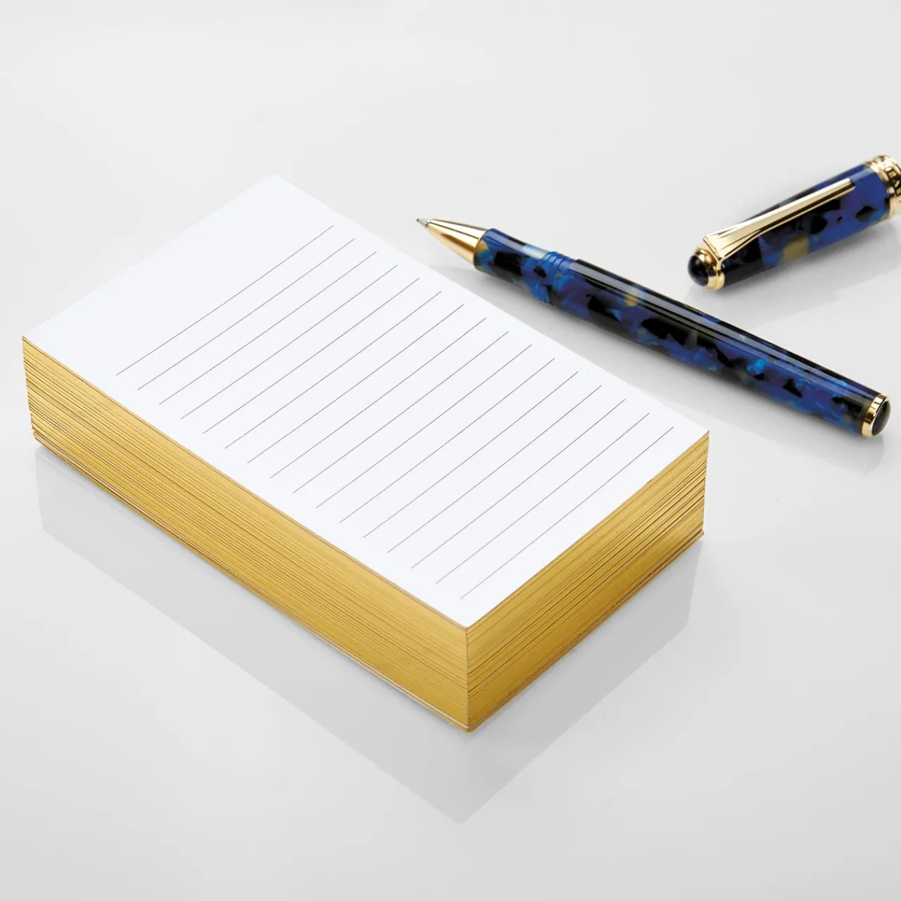 Our smooth and substantial 3 x 5 index cards with gilded edges. Edged in gilt and crafted in our ultra-smooth and sturdy 250-gsm card stock, friendly to all ink types, these deluxe note cards add a rarefied air of elegance to everyday note-taking.