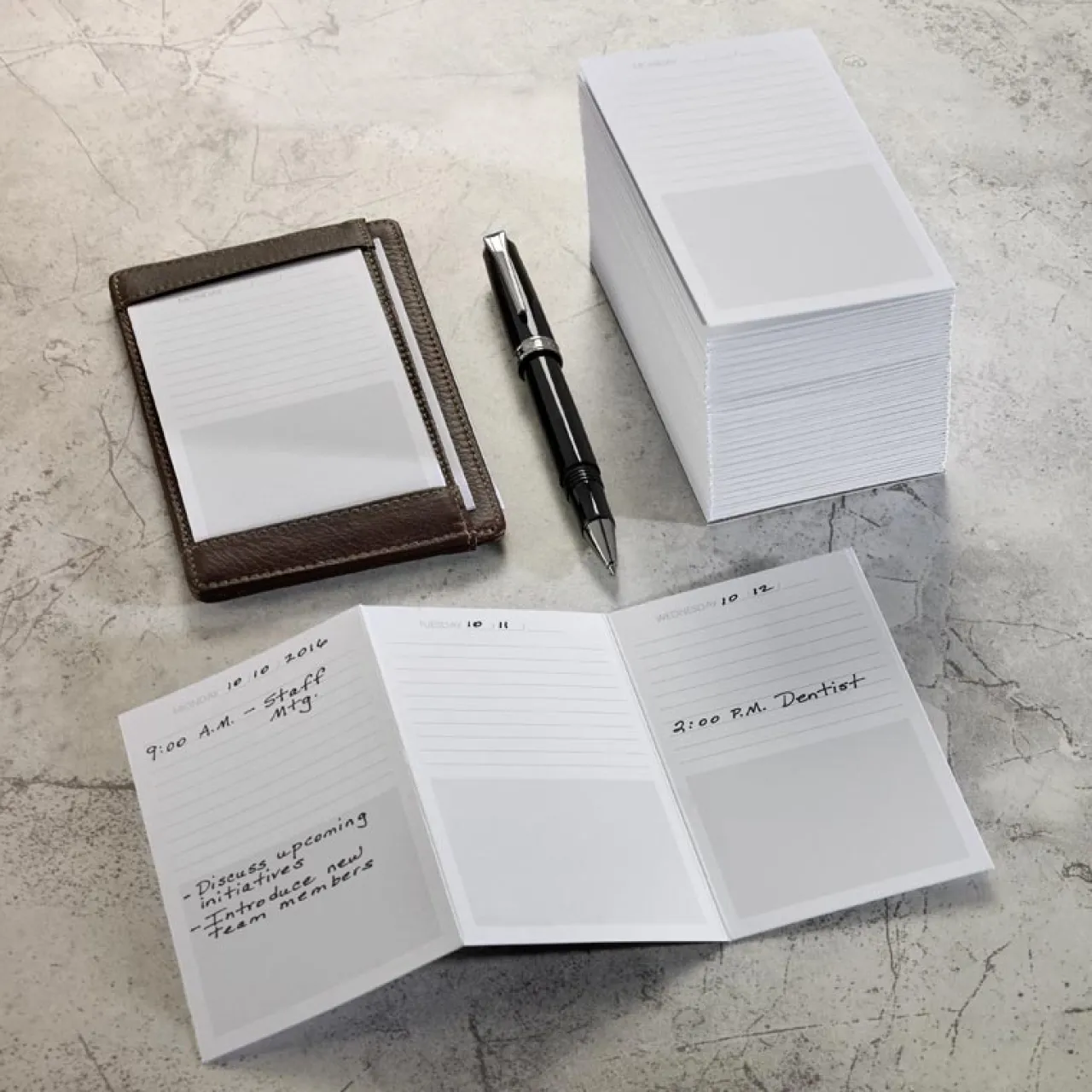 Foldable 3 x 5 weekly planner. Now there’s a way to fold up your week and store it neatly inside your pocket with the Triple-Decker Pocket Planner. It’s a thick, double-sided sheet of card stock that’s friendly to all types of ink, with ruled lines and shaded blank areas for writing appointments, notes or lists on each day of the week. Fits perfectly into a Levenger (available separately).