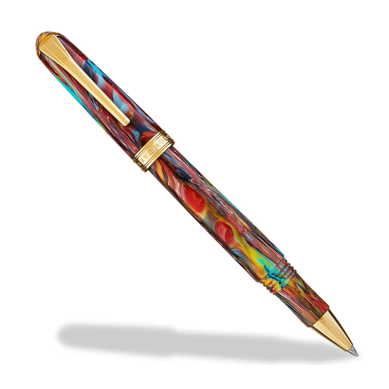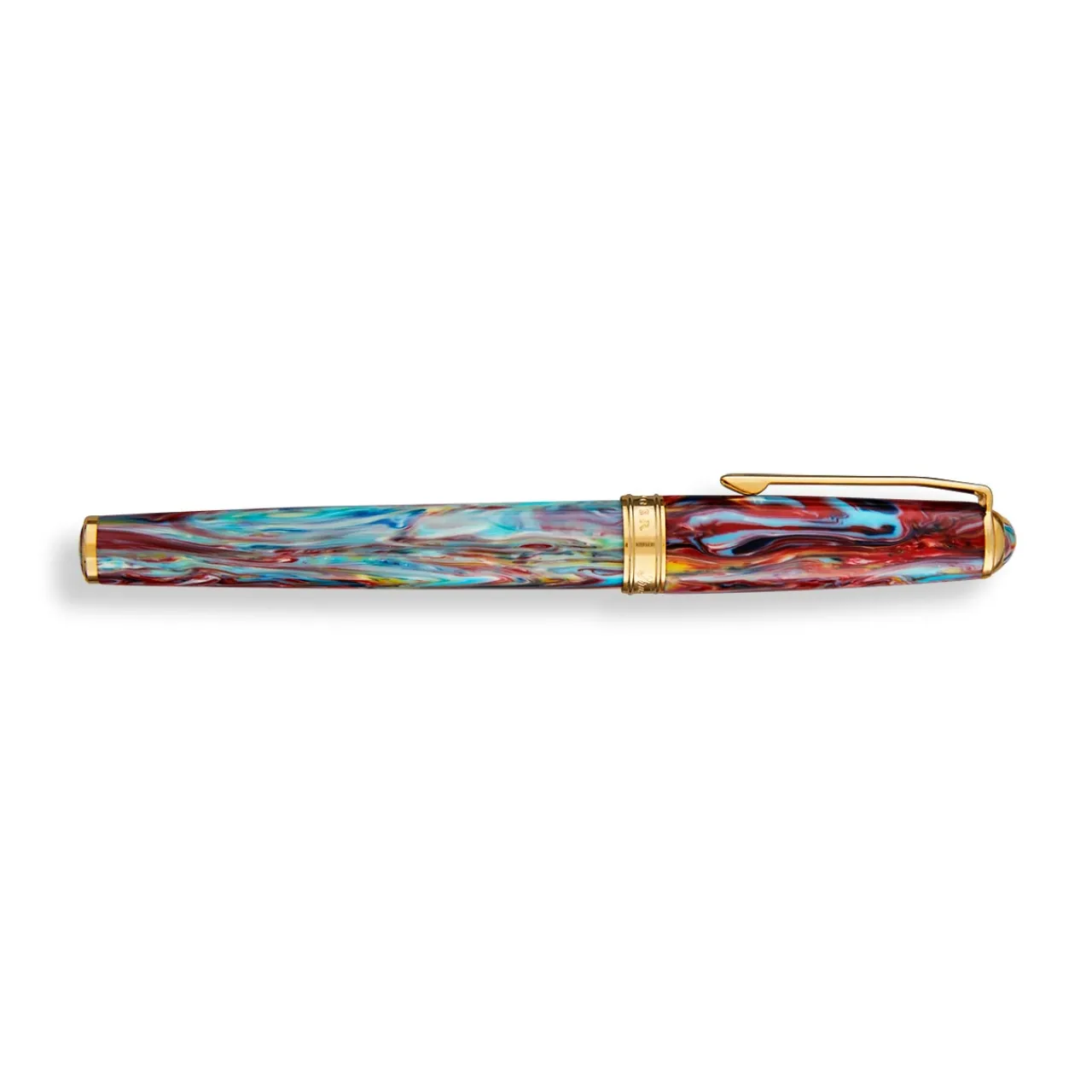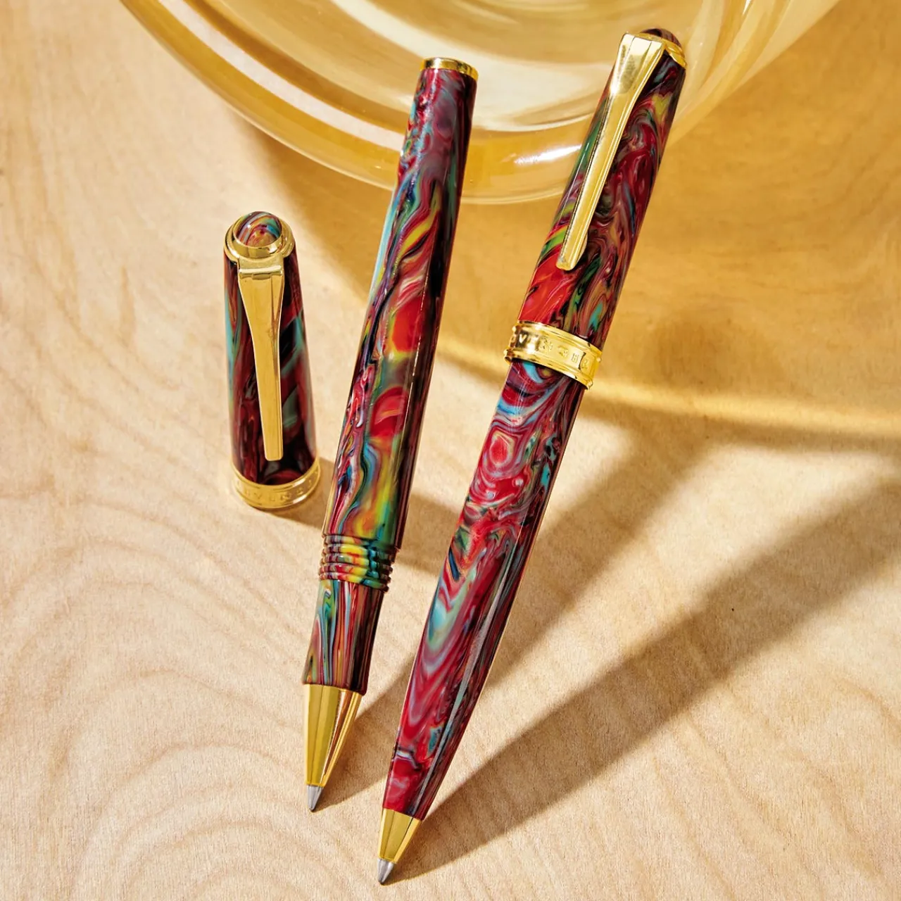 – Hand-turned resin barrel with ripples of blue, red, yellow and green—no two are exactly alike
